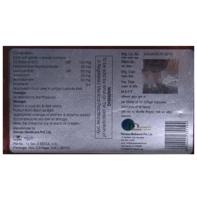 Coenzyme Q10 (100mg) + Vitamin B6 (Pyridoxine) (25mg) + Levo-carnitine (50mg) + Resveratrol (25mg) + Benfotiamine (50mg):<packagingdetail>:Strip: