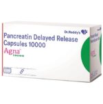 What does Agna 10000 Capsule DR help with?::: Agna 10000 Capsule DR is a pancreatic enzyme supplement created with a mixture of enzymes. It is given to patients whose pancreas is not able to create enough of their own enzymes to digest the food. It is also given to treat digestion problems caused in patients whose pancreas have been surgically removed or are not working well. | Is it safe to take Agna 10000 Capsule DR?::: Agna 10000 Capsule DR is usually safe in patients who have been prescribed to take it for digestion issues caused due to problems of the pancreas. Agna 10000 Capsule DR can cause an increase in blood uric acid levels, thereby worsening your gout and causing painful swollen joints. Agna 10000 Capsule DR may also cause allergic reactions like skin rashes, swollen lips, increased flatulence, stomach pain, headache, dizziness, etc. Consult your doctor before you start taking this medicine and give a proper history of allergies and the medicines you are currently taking.| How should I take Agna 10000 Capsule DR?::: Take the capsule with food and swallow it as a whole. Drink plenty of fluids after taking the medicine. It is very essential to increase your fluid intake while taking Agna 10000 Capsule DR. In case you have trouble swallowing capsules, you can take out the granules from the capsules and mix them with fruit juices or yoghurt and swallow it. Just be careful not to crush the granules.| What food should I eat if I have pancreatic enzyme insufficiency?::: You should try to take five small meals to make it easier for your pancreas to digest what you eat. Take a well-balanced, low-fat diet and strictly limit the foods which contain a high amount of saturated and trans fats. Your diet should preferably contain whole grains, fruits, vegetables, fat-free meat/poultry, beans and low-fat dairy sources. Drink plenty of fluids and water throughout the day to stay hydrated. Ask your doctor if you can take regular vitamin like A, D, E, and K, as it will be benefecial for you. You can have limited amounts of healthy polyunsaturated fat. Avoid smoking or drinking alcohol strictly because this can damage your pancreas.| Can Agna 10000 Capsule DR be given in children?::: Yes, Agna 10000 Capsule DR can be given to children. Just like adults, even children need to be given a sufficient amount of fluids while on treatment with Agna 10000 Capsule DR. When giving it to infants aged 12 months or less, you can open the capsule and empty the contents directly into the infant’s mouth. Following this, you can feed breast milk or infant milk formula to your baby. However, do not mix the medicine directly into the formula or breast milk. Also, be cautious to see that the baby swallows the entire medicine and nothing is retained in the baby’s mouth, as it can cause irritation in the mouth.: