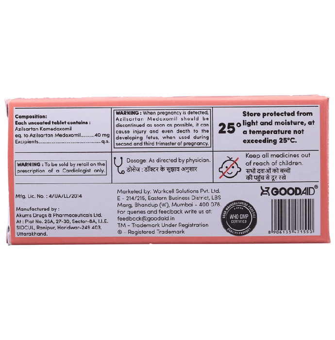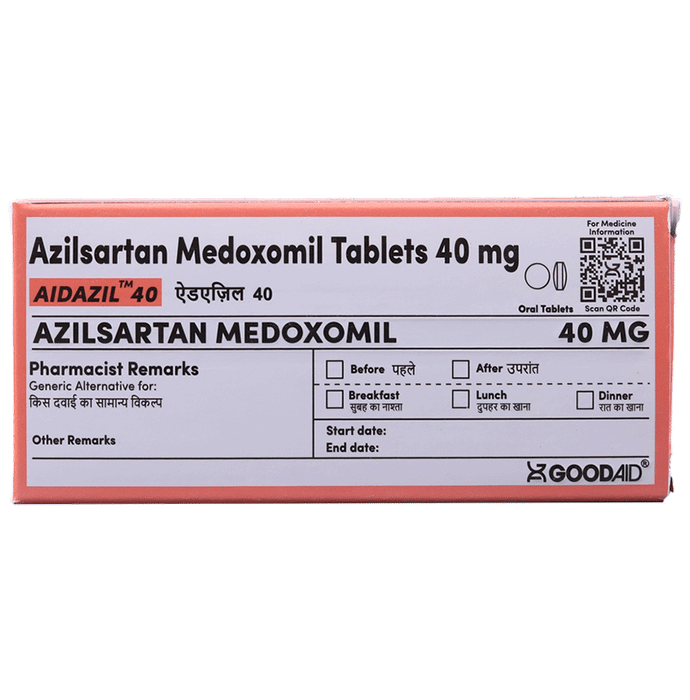 Aidazil 40 Tablet is a medicine used to treat high blood pressure and heart failure. Lowering blood pressure helps to prevent future heart attack and stroke. This medicine is also effective in preserving kidney function in patients with diabetes. Aidazil 40 Tablet can be prescribed either alone or in combination with other medicines. It may be taken with or without food during the day or at night. However, try to take it at the same time each day to get the most benefit. It is important to continue taking it regularly even if you feel well or if your blood pressure is controlled. Most people with high blood pressure do not feel ill, but if you stop taking this medicine, your condition could get worse. This is a widely used medicine and is considered safe for long-term use.Making some changes in your lifestyle will also help lower your blood pressure. These may include regular exercise, losing weight, smoking cessation, reducing alcohol intake, and reducing the amount of salt in your diet as advised by your doctor. This medicine is tolerated well by most patients and has few side effects. Dizziness, particularly after the first dose, is known to occur in some people. This may be associated with headache. Let your doctor know if these side effects bother you or do not go away. No weight gain has been seen with the regular use of this medicine.Before taking this medicine, let your doctor know if you have any kidney or liver problems. Pregnant or breastfeeding mothers should also consult their doctor before taking it. Your doctor may check your kidney function, blood pressure, and potassium levels in your blood at regular intervals while you are taking this medicine.