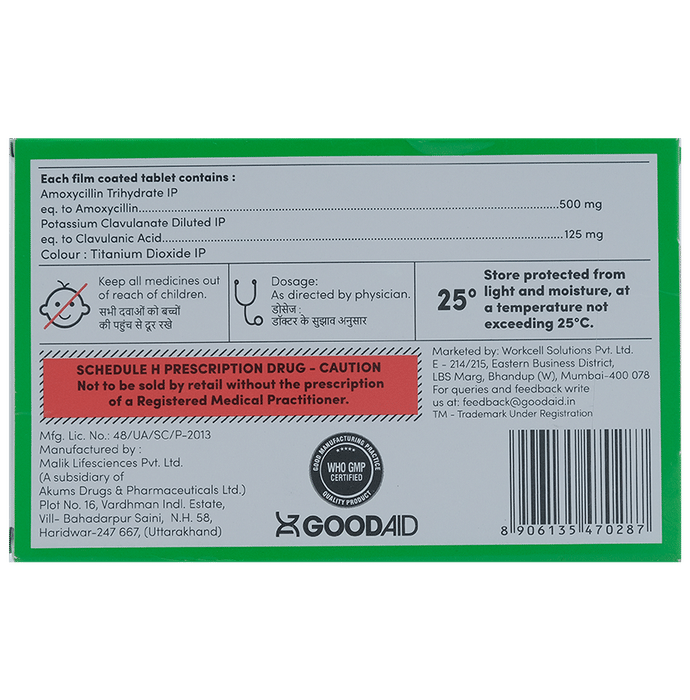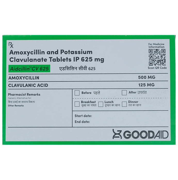 Aidcillin CV 625 Tablet is an antibiotic that helps your body fight infections caused by bacteria. It is used to treat infections of the lungs (e.g., pneumonia), ear, nasal sinus, urinary tract, skin, and soft tissue. It will not work for viral infections such as the common cold. Aidcillin CV 625 Tablet is best taken with a meal to reduce the chance of a stomach upset. You should take it regularly at evenly spaced intervals as per the schedule prescribed by your doctor. Taking it at the same time daily will help you remember to take it. The dose will depend on what you are being treated for, but you should always complete an entire course of this antibiotic as your doctor prescribes. Please do not stop taking it until you have finished, even when you feel better. If you stop taking it early, some bacteria may survive, and the infection may return or worsen.The most common side effects of Aidcillin CV 625 Tablet include nausea, diarrhea, vomiting, fungal infections of the mouth, skin fold or vagina, skin rashes, and vaginitis. These are usually mild, but let your doctor know if they bother you or will not go away.Before taking it, let your doctor know if you are allergic to any antibiotics or have kidney or liver problems. You should also inform your healthcare team about all other medicines you are taking as they may affect or be affected by Aidcillin CV 625 Tablet. This medicine is generally considered safe to use during pregnancy and breastfeeding if prescribed by a doctor.