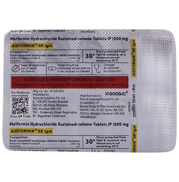 Aidformin SR 1gm Tablet is a medicine used to treat type 2 diabetes mellitus. It helps control blood sugar levels and thus prevent serious complications of diabetes. It is also used to treat a menstruation-related disorder known as Polycystic ovary syndrome (PCOS) in women. Aidformin SR 1gm Tablet is best taken with food to avoid nausea and abdominal pain. You should take it regularly, at the same time each day, to get the most benefit. You should not stop taking this medicine unless your doctor recommends it. Your lifestyle plays a big part in controlling diabetes. Therefore, it is important to stay on the diet and exercise program recommended by your doctor while taking this medicine. The most common side effects of this medicine include diarrhea, nausea, vomiting, flatulence, weakness, indigestion, abdominal discomfort, headache, and loss of appetite. Some people may develop hypoglycemia (low blood sugar level) when this medicine is taken along with other antidiabetic medicines, alcohol, or upon skipping a meal. Monitor your blood sugar levels regularly while taking it.Before taking this medicine, inform your doctor if you have any kidney, liver, or heart problems. Pregnant or breastfeeding women should also consult their doctor before taking it. Your doctor will check your kidney function tests before starting treatment with it. Avoid excessive alcohol intake while taking it as this may increase the risk of developing some side effects.