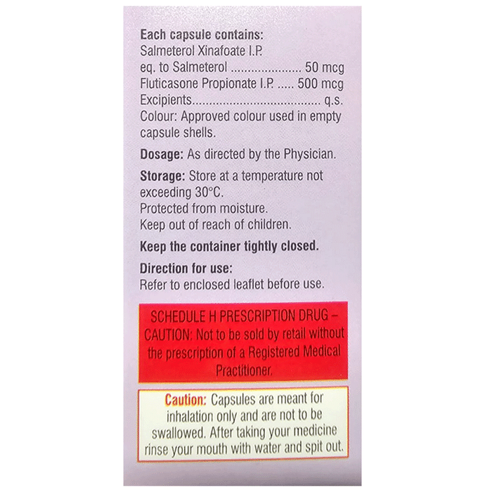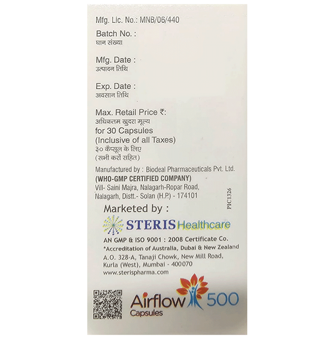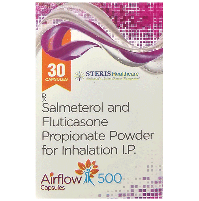Airflow 500 Capsule is a combination of two medicines that opens the airways and makes it easier to breathe. It is used in the treatment of asthma (wheezing and shortness of breath) and chronic obstructive pulmonary disorder (a lung disorder in which the flow of air to the lungs is blocked). Your doctor will tell you how often you need to use your inhaler. The effect of this medicine may be noticeable after a few days but will only reach its maximum after a few weeks. This medicine must be used regularly to be effective, so go on taking it even if you don’t have any symptoms. That means it’s doing its job. If you stop taking it your asthma and chronic obstructive pulmonary disorder (COPD) may get worse. It should not be used to relieve sudden asthma attacks. If an asthma attack occurs, use your quick-relief inhaler (reliever). To get the benefit from this medicine you need to make sure you get your inhaler technique right, otherwise, it does not work as well.The most common side effects are nausea, vomiting, respiratory tract infection, fungal infections in the mouth, headache, hoarseness of voice, sore throat, cough, musculoskeletal (bone, muscle, or joint) pain, and increased heart rate. If you get there, do not stop taking it but do talk to your doctor. You can help prevent some of these symptoms by rinsing your mouth and throat with water or brushing your teeth after using your inhaler. There are other, rarer side effects that can be serious. Talk to your doctor if you’re worried about them. In general, you should be trying to avoid situations that make your asthma worse (your triggers) and try not to smoke.Ask your doctor whether it’s safe to take this medicine if you’re pregnant or breastfeeding. Before taking it, you should tell your doctor if you have any kidney or liver diseases so that your doctor can prescribe a suitable dose for you.