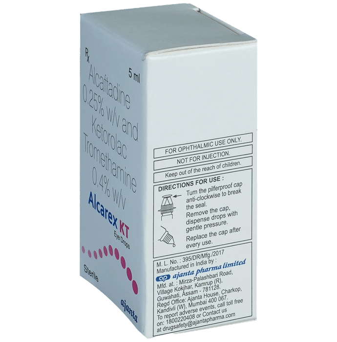 Alcarex KT Eye Drop is a prescription medicine used in the treatment of allergic conjunctivitis. It treats allergy symptoms such as itching, swelling, and redness. It also relieves redness, swelling, and pain. Alcarex KT Eye Drop is to be used only in the affected eye. Use it in the dose and duration as advised by the doctor. Read the label carefully for instruction before you use the medicine. Wash your hands before using this medicine. Do not use too much or too little. Use it in the exact dose as prescribed by the doctor or as instructed in the label.Use of this medicine may cause burning sensation, stinging, and irritation at the application site. These are usually temporary and resolve with time. However, if they persist or get worse, inform your doctor. In case of accidental contact with your ears, nose, or mouth, immediately rinse it with water.Inform your doctor if you have a known allergy to any of the ingredients in this medicine or if you are taking any other medication. It is advised not to drive or operate heavy machinery immediately after using this medicine as it may cause temporary blurring of vision and may affect your ability to drive.