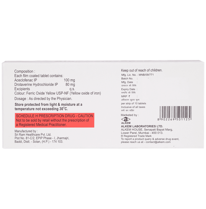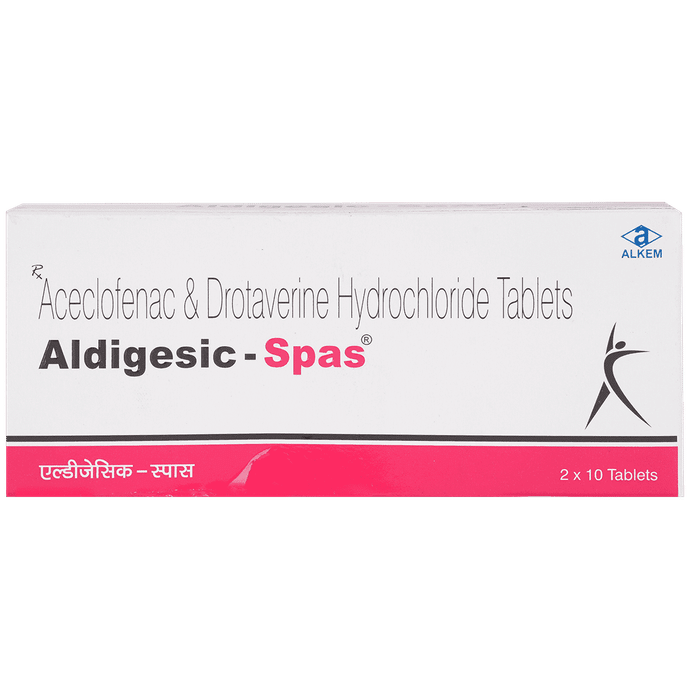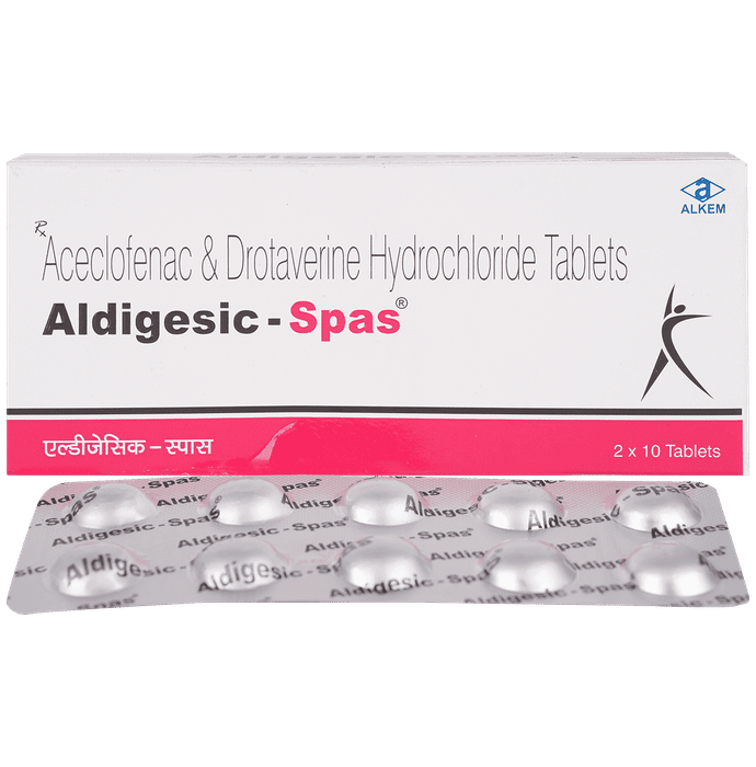 Aldigesic Spas 80mg/100mg Tablet is a combination of two medicines: Drotaverine and Aceclofenac, which relieves abdominal pain and cramps. Drotaverine is an anti-spasmodic medicine which relieves contractions (spasms) associated with smooth muscles in the abdomen. Aceclofenac is a non-steroidal anti-inflammatory drug (NSAID). It works by blocking the release of certain chemical messengers that cause abdominal pain and inflammation (swelling).: