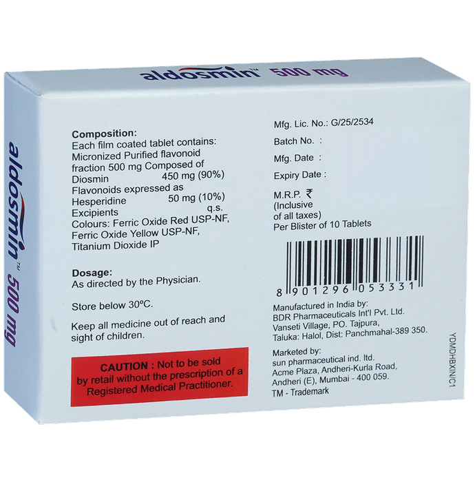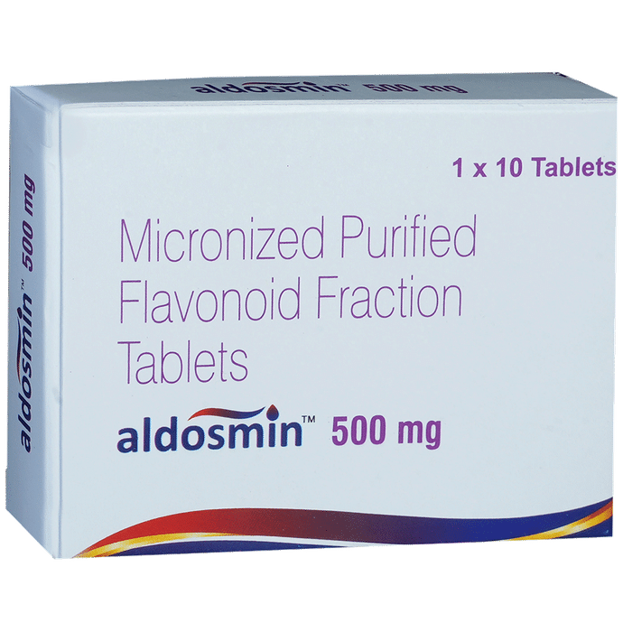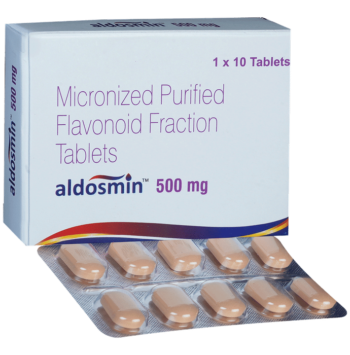 Aldosmin 500mg Tablet is a combinational medicine used in the treatment of varicose veins and acute and chronic piles (hemorrhoids). It improves blood flow in the veins and restores its function. Aldosmin 500mg Tablet can be taken with or without food in a dose and duration as advised by the doctor. You should keep taking this medicine for as long as your doctor recommends. If you stop treatment too early your symptoms may come back and your condition may worsen.The most common side effects are itching, stomach pain, nausea, vomiting, indigestion, and dizziness. Most of these are temporary and usually resolve with time. Contact your doctor straight away if you are at all concerned about any of these side effects. This medicine may also cause diarrhea, so it is better to take plenty of fluids while taking this medicine as it may help to prevent dehydration. Lifestyle modifications like reducing smoking, increasing exercise and a healthy diet will help you to get better results.Pregnant or breastfeeding women should consult their doctor before taking this medicine. You should let your doctor know if you have liver or kidney heart problems. Let your doctor know about all other medications you are taking as some may affect, or be affected by this medicine.: