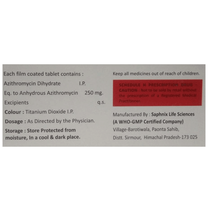 Alead 250 Tablet is an antibiotic used to treat various types of bacterial infections of the respiratory tract, ear, nose, throat, lungs, skin, and eye in adults and children. It is also effective in typhoid fever and some sexually transmitted diseases like gonorrhea. Alead 250 Tablet is taken orally, preferably one hour before or 2 hours after a meal. It should be used regularly at evenly spaced time intervals as prescribed by your doctor. Do not skip any doses and finish the full course of treatment even if you feel better. Stopping the medicine too early may lead to the return or worsening of the infection.Commonly seen side effects seen with this medicine include vomiting, nausea, stomach pain, headache, and diarrhea. These are usually temporary and subside with the completion of treatment. Consult your doctor if you find these side effects worry you or persist for a longer duration.Do not use Alead 250 Tablet if you have a history of cholestatic jaundice or hepatic dysfunction that happened with the use of azithromycin. Inform your doctor if you have any previous history of allergy or heart problems before taking this medicine. Pregnant or breastfeeding women should consult their doctor before using this medicine.: