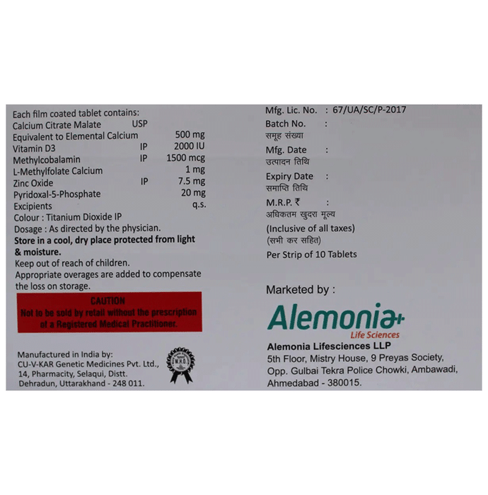 Alecium-XT Tablet is a combination of certain vitamins and minerals. Calcium citrate malate is a form of calcium that is easily absorbed by the body. It provides a source of bioavailable calcium, which is readily utilized by the bones and other tissues. L-Methyl folate calcium is the active form of folic acid that is necessary for the DNA synthesis, cell division, and production of red blood cells. It also supports various physiological processes, including those related to bone health. Methylcobalamin is a form of vitamin B12 that is essential for nerve health, DNA synthesis, and red blood cell production. Vitamin B12 also plays an indirect role in bone health by supporting the proper functioning of the nervous system, which is involved in bone regulation. Pyridoxal-5-phosphate is the active form of vitamin B6. It is involved in many enzymatic reactions in the body and is necessary for protein metabolism. Zinc oxide provides zinc that is needed for the body’s immune system to work properly. Zinc also promotes bone density and prevents bone loss.: