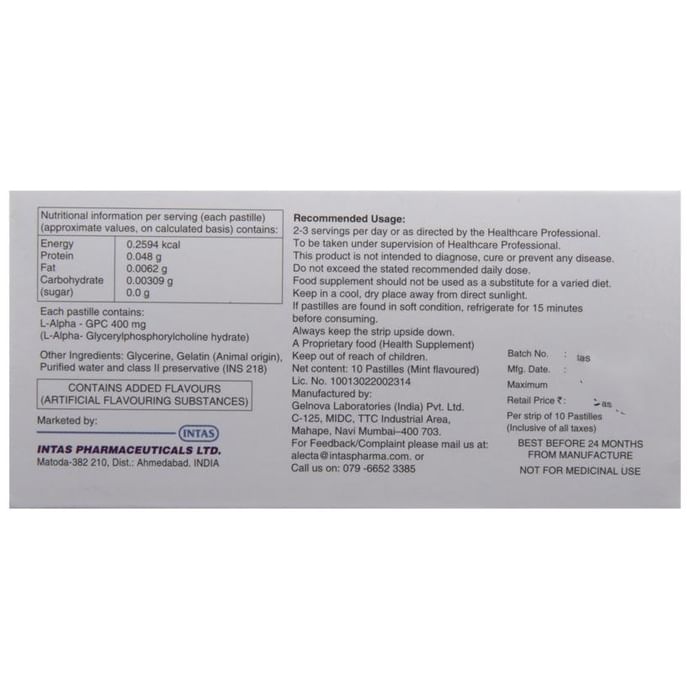 Alfa GPC Pastilles is a plant-based fatty acid. It is used as a nutritional supplement that may help improve neurological health. Alfa GPC Pastilles can be taken with or without food. Take it regularly and at a fixed time each day to get the maximum benefit from it. Inform your doctor before taking the medicine if you have any other medical conditions or are taking any other medications.Alfa GPC Pastilles is usually a safe medicine. However, it may cause dry mouth in some people. If you experience any other symptoms which you think are due to the medicine, inform your doctor.Before starting the medicine, inform your doctor if you have any other medical or psychological conditions or are taking any other medications. Pregnant and breastfeeding women must take this medicine only with a valid prescription.: