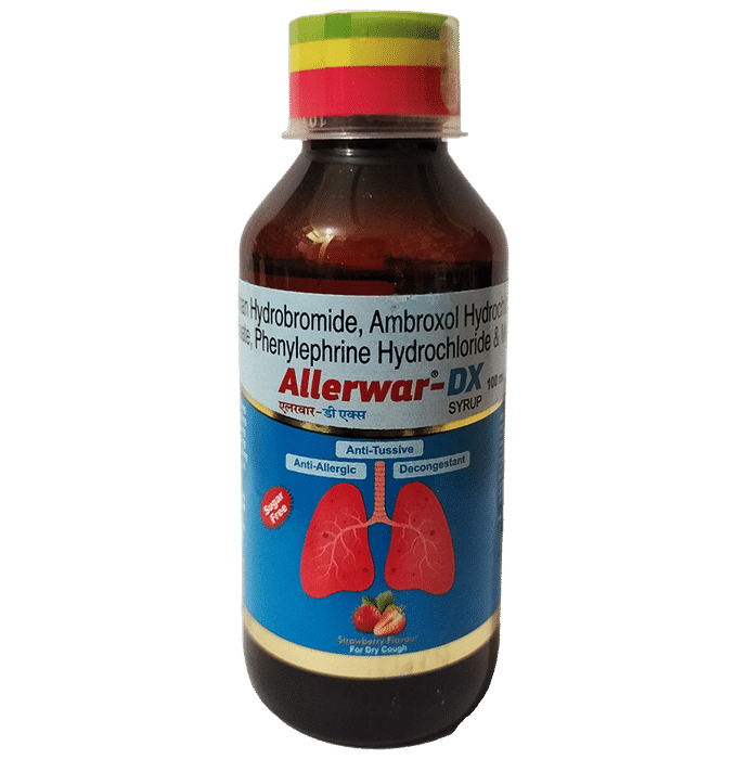 Allerwar-DX Syrup Strawberry Sugar Free is used in the treatment of cough. It helps by thinning the mucus in the nose and windpipe, making it easier to cough out. It also relieves allergy symptoms like watery eyes, sneezing, runny nose, and throat irritation. Allerwar-DX Syrup Strawberry Sugar Free is taken with or without food in a dose and duration as advised by the doctor. The dose you are given will depend on your condition and how you respond to the medicine. You should keep taking this medicine for as long as your doctor recommends. Let your doctor know about all other medications you are taking as some may affect, or be affected by this medicine.The most common side effects are headache, nausea, vomiting, and stomach upset. Most of these are temporary and usually resolve with time. Contact your doctor straight away if you are at all concerned about any of these side effects. This medicine can also cause sleepiness, so do not drive or do anything that requires mental focus until you know how this medicine affects you. Avoid drinking alcohol while taking this medicine as it can make sleepiness worse.Never support self-medication or recommend your medicine to another person. It is beneficial to have plenty of fluids while taking this medication. Before you start taking this medicine it is important to inform your doctor if you are suffering from any lung, liver or kidney disease. You should tell your doctor if you are pregnant or planning a pregnancy.