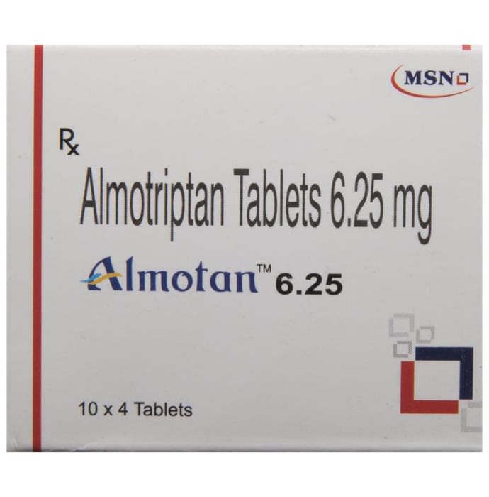 Is Almotan 6.25 Tablet a narcotic? Does it have abuse potential?::: No, Almotan 6.25 Tablet is neither a narcotic nor does it have abuse potential. It is an antimigraine agent which belongs to a class of compounds known as selective serotonin receptor agonists.| How often can I take Almotan 6.25 Tablet?::: The maximum daily dose is two tablets within 24 hours. However, a gap of at least 2 hours between first and second dose needs to be maintained.| Can I take ibuprofen with Almotan 6.25 Tablet?::: Almotan 6.25 Tablet may take 2-3 hours to show its effect, wait for it to work. If still there is no considerable improvement then you can take NSAIDs (e.g., ibuprofen), but do not take additional triptans for relief. | Can Almotan 6.25 Tablet be used for migraine prophylaxis or cluster headaches?::: Almotan 6.25 Tablet is not used for the prevention of migraine attacks or cluster headaches. However, it should only be used in cases where a clear diagnosis of migraine has been established.| How many times can I take Almotan 6.25 Tablet in a month?::: Almotan 6.25 Tablet is safe if you are taking this medicine for four migraine episode in a 30-day period. However, it has not been established that the medicine is safe if used for treating an average of more than four migraine episodes in a 30-day period.| What should I tell my doctor?::: Before taking Almotan 6.25 Tablet, you should inform your doctor if you have a heart disease or any risk factor associated with it (e.g., high blood pressure, diabetes, smoking, family history of heart disease, men over 40 years of age, or a postmenopausal women), mild to moderate liver disease, or severe kidney disease. The doctor should be informed if your headache is associated with dizziness, difficulty in walking, lack of coordination, or weakness in the leg and arm. Along with that, it is important to inform your doctor if you are taking medicines such as selective serotonin reuptake inhibitors (SSRIs) (e.g., sertraline, escitalopram oxalate, and fluoxetine) or serotonin norepinephrine reuptake inhibitors (SNRIs) (e.g., venlafaxine), and duloxetine for depression.| Does migraine run in families?::: Yes, Migraines may run in families. Migraines occur more often in women than men. It has been observed that some women, but not all, have fewer migraine attacks when they are pregnant.: