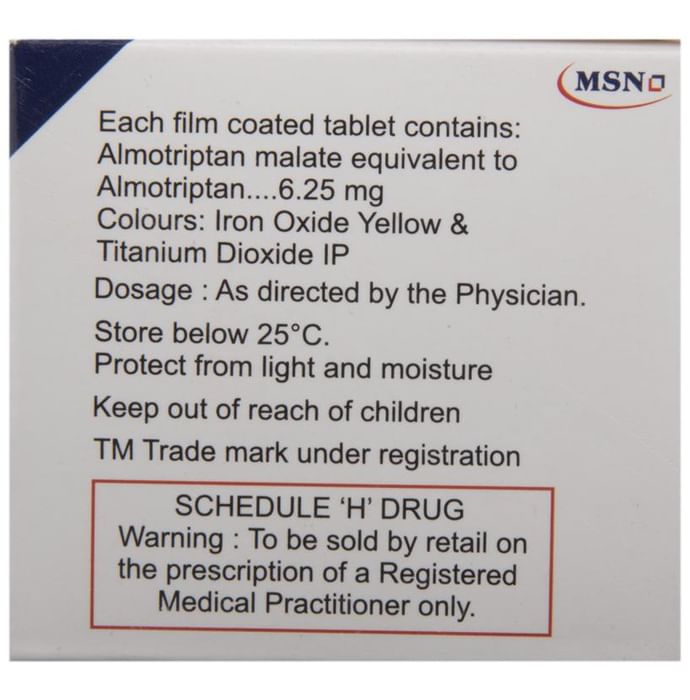 Almotan 6.25 Tablet is used in the treatment of acute attacks of migraine. It relieves the symptoms of migraine and prevents the attack from becoming worse. This medicine helps by narrowing the blood vessels, thereby relieving migraine headaches. Almotan 6.25 Tablet may be taken with or without food. However, it is advised to take it at the same time each day as this helps to maintain a consistent level of medicine in the body. Do not skip any doses and finish the full course of treatment even if you feel better and if you have missed a dose, take it as soon as you remember. You should continue to take this medicine for as long as the doctor advises and do not stop taking it suddenly.The most common side effects of this medicine include nausea, vomiting, dry mouth, paresthesia, dizziness, sleepiness, and headache. These are usually temporary and resolve on their own. Consult your doctor if these do not subside or get worse. They may be able to suggest ways to reduce or prevent the side effects.It may also cause sleepiness at the beginning of your treatment, so do not drive, operate machinery, until you know how this medicine affects you. This medicine may cause changes in your mood and you may feel depressed, therefore, regular monitoring of behavior is important. Pregnant or breastfeeding mothers should consult their doctor before taking this medicine.Inform your doctor if you are suffering from any heart problems, as the use of Almotan 6.25 Tablet is contraindicated in some heart diseases. Regular monitoring of blood pressure is required while taking this medicine. Consult your doctor and stop this medicine if you develop severe chest or stomach pain, bloody diarrhea, or significantly high blood pressure, after taking this medicine.: