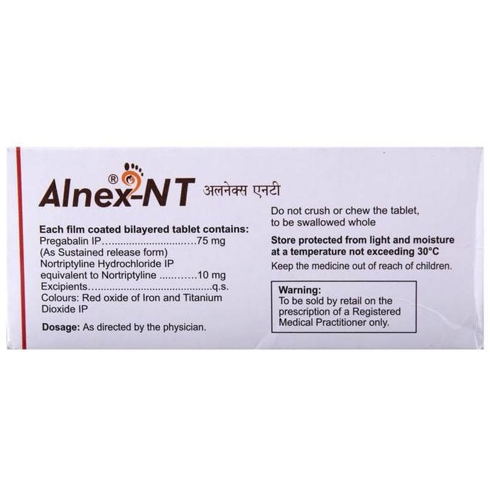 Alnex NT 75mg/10mg Tablet is a combination medicine used for the treatment of neuropathic pain. This medicine decreases the pain by stopping the movement of pain signals to the brain. Alnex NT 75mg/10mg Tablet is taken by mouth, with or without food and preferably at bedtime. It is advised to take it at the same time each day as this helps to maintain a consistent level of medicine in the blood. Take this medicine in the dose and duration advised by your doctor as this is a habit-forming medicine. If you miss a dose of this medicine, take it as soon as you remember. Finish the full course of treatment even if you feel better. It is important not to stop this medication suddenly without talking to the doctor.Some common side effects of this medicine include constipation, difficulty in urination, weight gain, tiredness, and dryness in mouth. It may also cause dizziness and sleepiness. So, do not drive or do anything that requires mental focus until you know how this medicine affects you. This medicine may cause weight gain and to control it, you should exercise regularly and take a balanced diet. It is important to inform your doctor if you develop any unusual changes in mood or behavior, new or worsening depression, or suicidal thoughts.Before taking this medicine let your doctor know if you suffer from kidney or liver disease. Your doctor should also know about all other medicines you are taking as many of these may make this medicine less effective or change the way it works. Inform your doctor if you are pregnant, planning pregnancy or breastfeeding.: