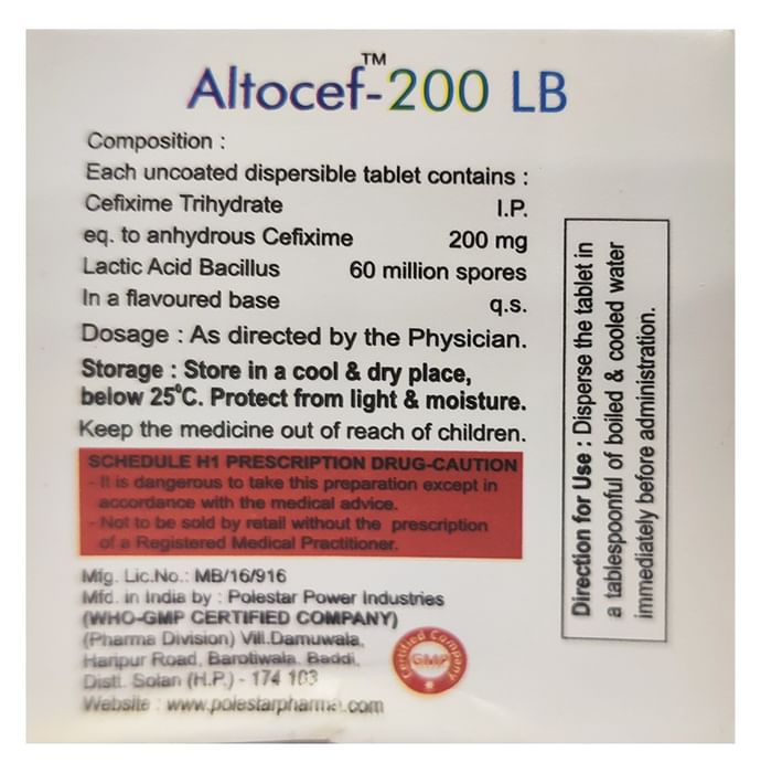 Altocef 200 LB Tablet is a combination medicine that is used to treat various types of bacterial infections. It fights against the microorganisms to prevent their growth and further spread of the infection. It also prevents diarrhea which may occur as side effect of this medicine. Altocef 200 LB Tablet is a prescription medicine. It is advised to take it as per the prescription. It can be taken with or without food, but it must be taken at a fixed time to ensure better efficacy. Do not consume more than the recommended dose, as this may have harmful effects on your body. If you miss a dose, take it as soon as you remember. The course of the treatment must be completed even if you feel better. Sudden discontinuation of the treatment may affect the potency of the medicine.Some common side effects of this medicine are nausea, vomiting, diarrhea, indigestion, etc. If any of the side effects get aggravated, you must consult your doctor immediately. If you experience any allergic reaction (rashes, itching, swelling, shortness of breath, etc.), you must seek immediate medical help.Before taking this medicine, you should tell your doctor if you are taking any medicines for any health condition. Pregnant or breastfeeding women should also consult with their doctor before taking it. Avoid drinking alcohol as it can cause excessive drowsiness with this medicine. It usually does not impair your ability to drive, but you should not drive if it makes you feel sleepy or dizzy. You must take adequate rest for a faster recovery, also take a healthy diet and drink plenty of water. Your doctor may ask for a few laboratory and diagnostic tests to know the effects of the medicine on your body.: