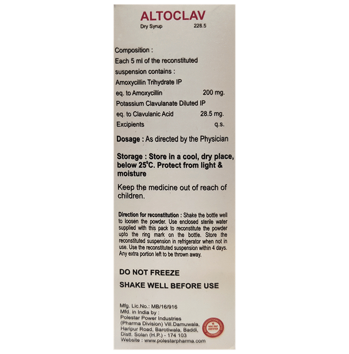 Altoclav Dry Syrup is an antibiotic that helps your body fight infections caused by bacteria. It is used to treat infections of the lungs (e.g., pneumonia), ear, nasal sinus, urinary tract, skin, and soft tissue. It will not work for viral infections such as the common cold. Altoclav Dry Syrup is best taken with a meal to reduce the chance of a stomach upset. You should take it regularly at evenly spaced intervals as per the schedule prescribed by your doctor. Taking it at the same time daily will help you remember to take it. The dose will depend on what you are being treated for, but you should always complete an entire course of this antibiotic as your doctor prescribes. Please do not stop taking it until you have finished, even when you feel better. If you stop taking it early, some bacteria may survive, and the infection may return or worsen.The most common side effects of Altoclav Dry Syrup include nausea, diarrhea, vomiting, fungal infections of the mouth, skin fold or vagina, skin rashes, and vaginitis. These are usually mild, but let your doctor know if they bother you or will not go away.Before taking it, let your doctor know if you are allergic to any antibiotics or have kidney or liver problems. You should also inform your healthcare team about all other medicines you are taking as they may affect or be affected by Altoclav Dry Syrup. This medicine is generally considered safe to use during pregnancy and breastfeeding if prescribed by a doctor.:
