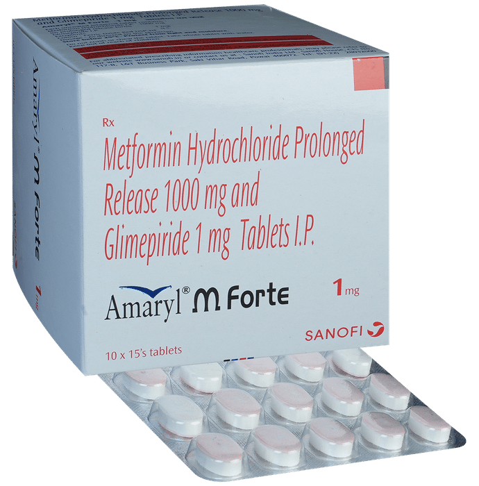 Amaryl M Forte 1mg Tablet PR belongs to a category of medicines known as anti-diabetic drugs. It is a combination of two medicines used to treat type 2 diabetes mellitus in adults. It helps control blood sugar levels in people with diabetes. Amaryl M Forte 1mg Tablet PR should be taken with food. Take it regularly at the same time each day to get the most benefit. Your doctor will decide what dose is best for you and this may change from time to time according to how it is working according to your blood sugar levels.Keep taking this medicine, even if you feel well or your blood sugar levels are controlled. If you stop it without consulting your doctor, your blood sugar levels could rise and put you at risk of kidney damage, blindness, nerve problems, and loss of limbs. Remember that it is only part of a treatment program that should also include a healthy diet, regular exercise, and weight reduction as advised by your doctor. Your lifestyle plays a big part in controlling diabetes.The most common side effect of Amaryl M Forte 1mg Tablet PR is low blood glucose levels (hypoglycemia). Make sure you recognize the signs of having low blood glucose levels, such as sweating, dizziness, headache, and shaking, and know how to deal with it. To prevent this, it’s important to have regular meals and always carry a fast-acting source of glucose such as sugary food or fruit juice with you. Drinking alcohol can also increase your risk of low blood sugar levels and should be avoided. Other side effects that may be seen on taking this medicine include taste changes, nausea, diarrhea, stomach pain, headache, and upper respiratory tract infection. Some people may find that they put on weight with this medicine.You should not take it if you have type 1 diabetes mellitus, if you have diabetic ketoacidosis (high levels of acid in your blood), or if you have severe kidney or liver disease. Before taking this medicine, tell your doctor if you have ever had heart disease. It may not be suitable. Pregnant or breastfeeding women should also consult their doctor before taking it. Your blood sugar levels should be checked regularly and your doctor may also advise blood tests to monitor your blood cell counts and liver function.: