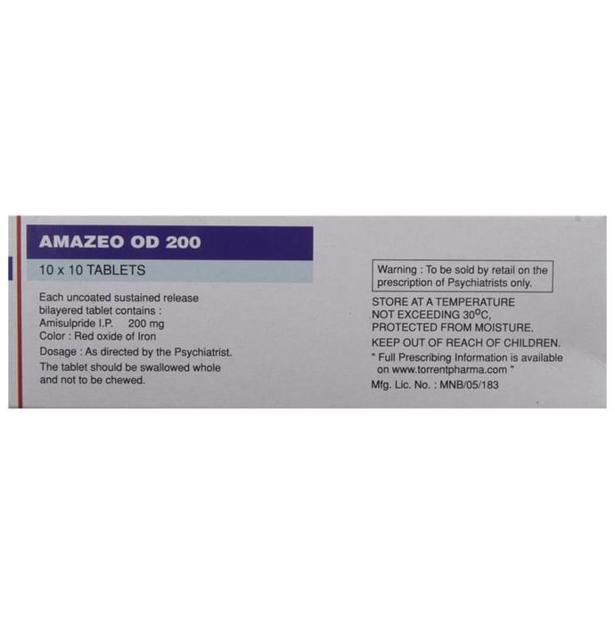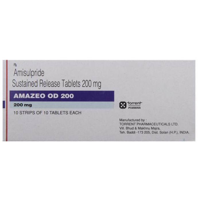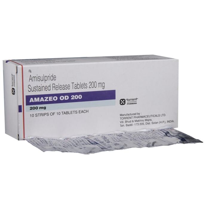 Amazeo OD 200 Tablet SR is a prescription medicine used in the treatment of schizophrenia, a mental disorder that can result in hallucinations or delusions and also adversely affects a person’s ability to think and behave. Amazeo OD 200 Tablet SR may be taken with or without food, preferably before bedtime. However, it is advised to take it at the same time each day as this helps to maintain a consistent level of medicine in the body. Take this medicine in the dose and duration as advised by your doctor and if you have missed a dose, take it as soon as you remember. Do not skip any doses and finish the full course of treatment even if you feel better. It is important that this medication is not stopped suddenly without talking to your doctor as it may worsen your symptoms.Some common side effects of this medicine include nausea, vomiting, dryness in the mouth, blurred vision, insomnia, and erectile dysfunction. Initially, this medicine may cause a sudden drop in blood pressure when you change positions, so it is better to rise slowly if you have been sitting or lying down. It also causes dizziness and sleepiness, so do not drive or do anything that requires mental focus until you know how this medicine affects you. This medicine can lead to weight gain and may increase your blood sugar and cholesterol levels. However, modifying your lifestyle by having a healthy diet and exercising regularly can reduce this side effect.:
