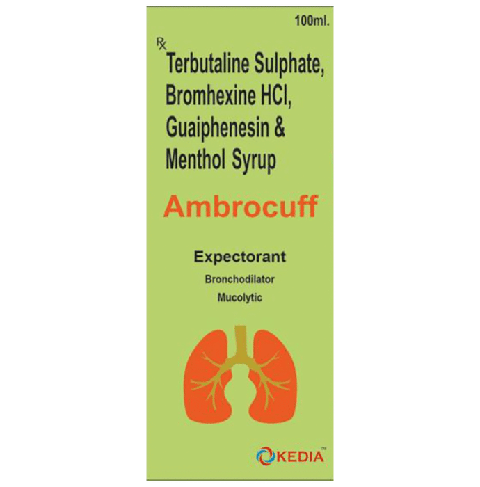 Ambrocuff Syrup is used in the treatment of cough. It thins mucus in the nose, windpipe and lungs, making it easier to cough out. It also produces a sensation of coolness and relieves minor throat irritation. Ambrocuff Syrup is taken with or without food in a dose and duration as advised by the doctor. The dose you are given will depend on your condition and how you respond to the medicine. You should keep taking this medicine for as long as your doctor recommends. If you stop treatment too early your symptoms may come back and your condition may worsen. Let your doctor know about all other medications you are taking as some may affect, or be affected by this medicine.The most common side effects are nausea, indigestion, bloating, vomiting, diarrhea, stomach pain, headache, sweating, skin rash, tremors, and increased heart rate. Most of these are temporary and usually resolve with time. Contact your doctor straight away if you are at all concerned about any of these side effects. This medicine can also cause sleepiness, so do not drive or do anything that requires mental focus until you know how this medicine affects you. Avoid drinking alcohol while taking this medicine as it can make sleepiness worse.Never support self-medication or recommend your medicine to another person. It is beneficial to have plenty of fluids while taking this medication. Before taking this medicine, you should tell your doctor if you are pregnant, planning pregnancy or breastfeeding.: