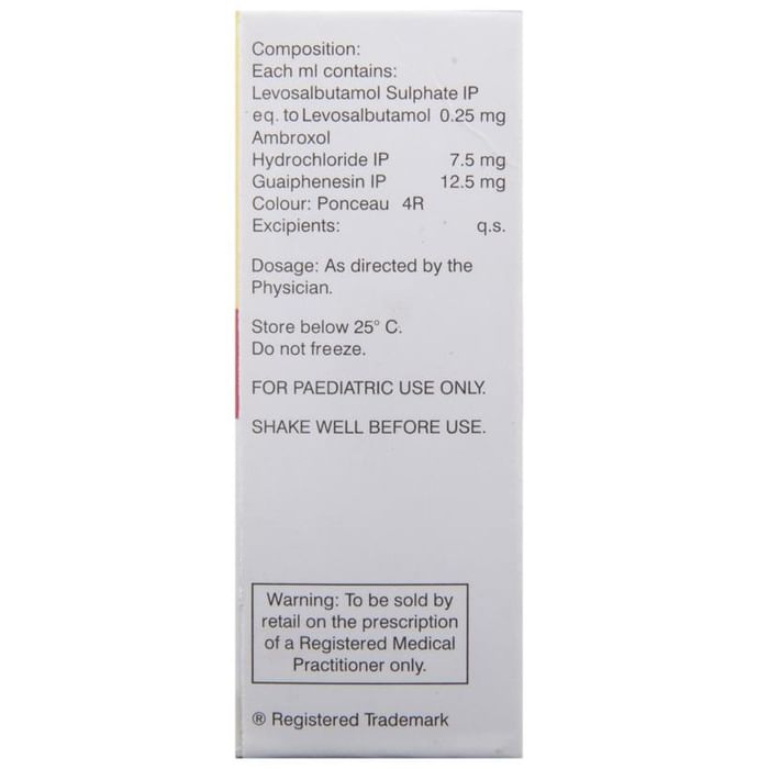 Ambrodil-LX Drop comprises three active ingredients that together help treat wet cough (cough with mucus), acute sore throat and asthma in children. It also relieves throat irritation, clears congestion, and enables easy breathing in your child. Ambrodil-LX Drop makes it easier for your child to cough out the mucus by increasing its water content and making it thin enough to be coughed out. Give this medicine to your child by mouth with or without food along with a full glass of water. If your child develops an upset stomach, prefer giving it with food.You may require to give this medicine to your child for a few days to weeks, depending upon the severity of the infection. For maximum benefit, do not stop the medication abruptly by yourself even if your child starts to feel better and continue the medicine until the full prescribed course. Do not give more than the prescribed dose for fast relief as it may cause unwanted effects and worsen your child’s condition.Some of the common side effects of this medicine include excessive production of saliva, fatigue, headache, dizziness, nausea, vomiting, diarrhea, stomach discomfort, rash, tremors, and numbness or tingling sensation in the hands or feet. Usually, these episodes subside once your child’s body adapts to the medicine. However, if these effects persist or become bothersome for your child, report to your child’s doctor immediately.Narrate your child’s complete medical history, including any previous episode of respiratory illness, allergy, heart-problem, blood disorder, birth defects, airway obstruction, lung anomaly, sinus issues, liver impairment, and kidney malfunction. This information is critical for dose alterations and for planning your child’s overall treatment.: