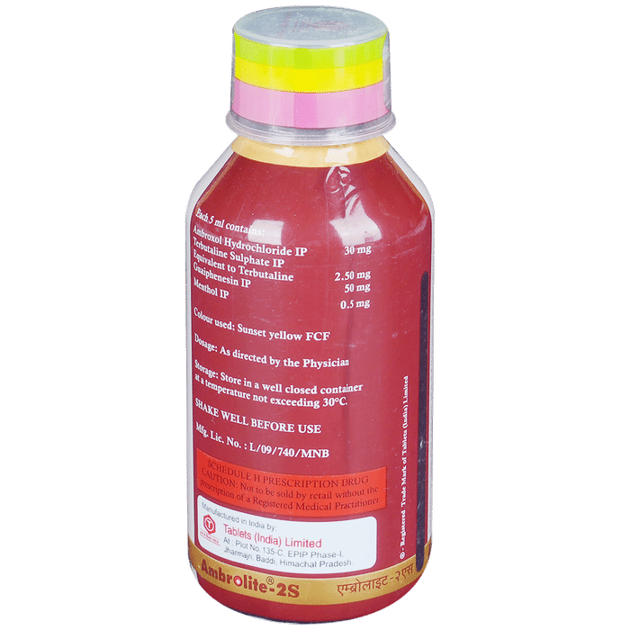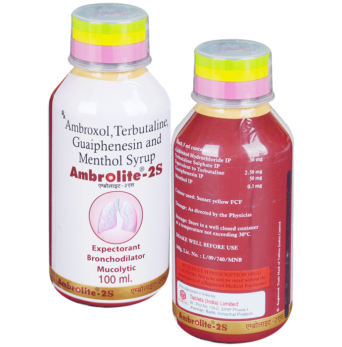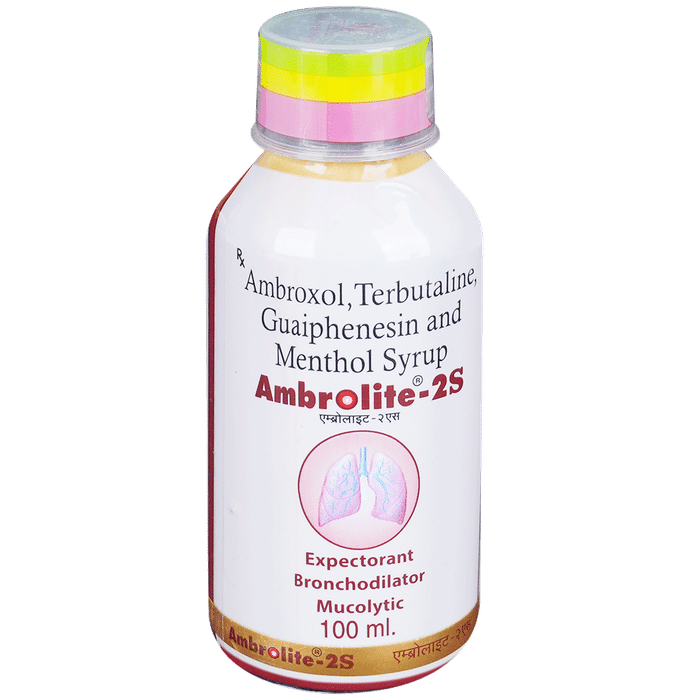 Ambrolite 2S Expectorant is a combination medicine used to treat cough. It thins the mucus in the nose and windpipe, making it easier to cough out. This medicine also relieves throat irritation and provides cooling sensation. Ambrolite 2S Expectorant is taken with or without food in a dose and duration as advised by the doctor. The dose you are given will depend on your condition and how you respond to the medicine. You should keep taking this medicine for as long as your doctor recommends. If you stop treatment too early your symptoms may come back and your condition may worsen. Let your doctor know about all other medications you are taking as some may affect, or be affected by this medicine.The most common side effects are nausea, diarrhea, vomiting, stomach discomfort, headache, rash, tremor, and increased heart rate. Most of these are temporary and usually resolve with time. Contact your doctor straight away if you are at all concerned about any of these side effects. This medicine can also cause sleepiness, so do not drive or do anything that requires mental focus until you know how this medicine affects you. Avoid drinking alcohol while taking this medicine as it can make sleepiness worse.Never support self-medication or recommend your medicine to another person. It is beneficial to have plenty of fluids while taking this medication. Before taking this medicine, you should tell your doctor if you are pregnant, planning pregnancy or breastfeeding.: