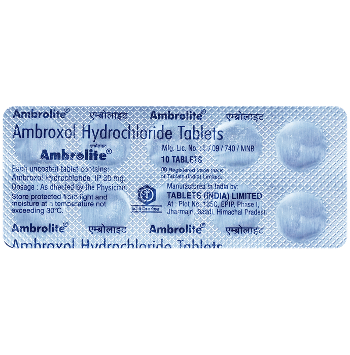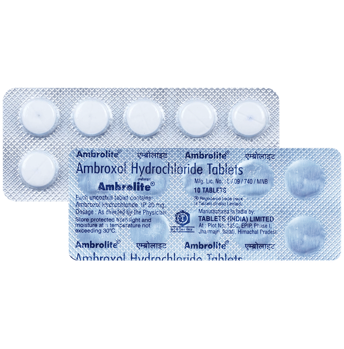 Ambrolite 30 Tablet is used for treating various respiratory tract disorders associated with excessive mucus. It works by thinning and loosens mucus in the nose, windpipe, and lungs and make it easier to cough out. Ambrolite 30 Tablet should be taken with food. For better results, it is suggested to take it at the same time every day. The dose and how often you take it depend on what you are taking it for. Your doctor will decide how much you need to improve your symptoms. It is advised not to use it for more than 14 days without your doctor’s consultation.The most common side effects of this medicine include vomiting, nausea, and stomach upset. Talk to your doctor if you are worried about side effects or they would not go away. Generally, it is advised not to take alcohol while on treatment.Before taking this medicine, tell your doctor if you have liver or kidney disease or if you have stomach problems. Your doctor should also know about all other medicines you are taking as many of these may make this medicine less effective or change the way it works. You must take a doctor’s advice before using this medicine if you are pregnant or breastfeeding.: