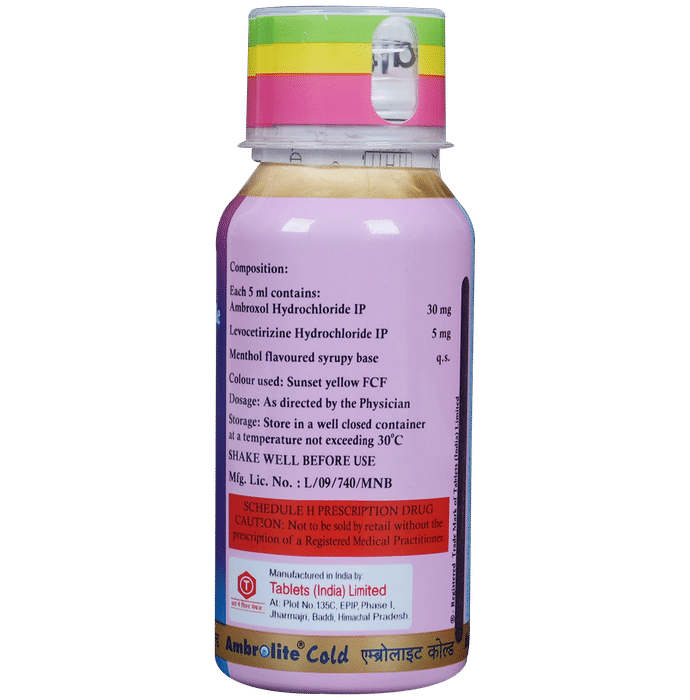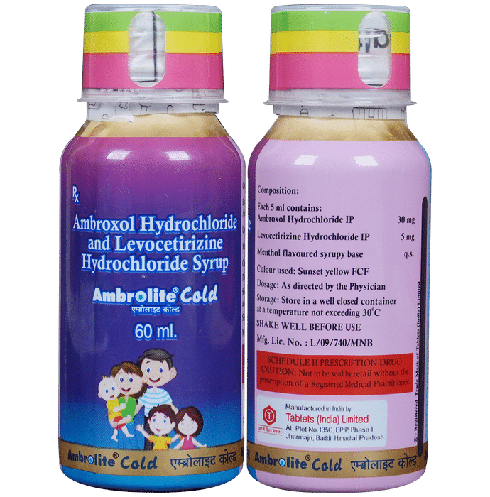 Ambrolite Cold Syrup is used for treating various respiratory tract disorders associated with excessive mucus. It works by thinning and loosens mucus in the nose, windpipe, and lungs and make it easier to cough out. Ambrolite Cold Syrup should be taken with food. For better results, it is suggested to take it at the same time every day.  The dose and how often you take it depend on what you are taking it for. Your doctor will decide how much you need to improve your symptoms.  It is advised not to use it for more than 14 days without your doctor’s consultation.The most common side effects of this medicine include vomiting, nausea, and stomach upset. Talk to your doctor if you are worried about side effects or they would not go away. Generally, it is advised not to take alcohol while on treatment.Before taking this medicine, tell your doctor if you have liver or kidney disease or if you have stomach problems. Your doctor should also know about all other medicines you are taking as many of these may make this medicine less effective or change the way it works. You must take a doctor’s advice before using this medicine if you are pregnant or breastfeeding.: