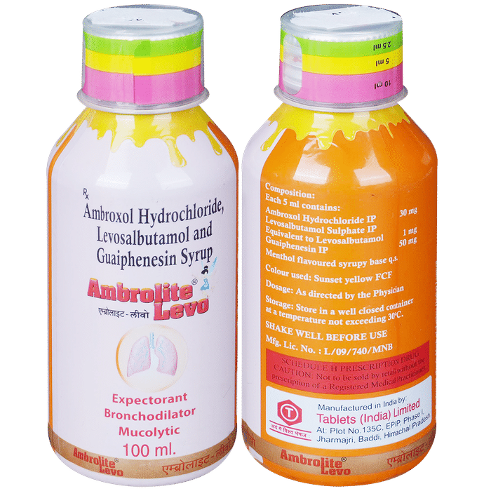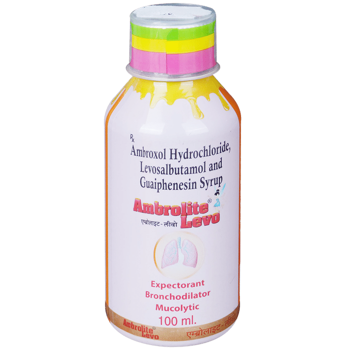 Ambrolite Levo Syrup is a combination medicine used in the treatment of cough with mucus. It thins mucus in the nose, windpipe, and lungs, making it easier to cough out. It also provides relief from runny nose, sneezing, itching, and watery eyes. Ambrolite Levo Syrup is taken with or without food in a dose and duration as advised by the doctor. The dose you are given will depend on your condition and how you respond to the medicine. You should keep taking this medicine for as long as your doctor recommends. If you stop treatment too early your symptoms may come back and your condition may worsen. Let your healthcare team know about all other medications you are taking as some may affect, or be affected by this medicine.The most common side effects are nausea, diarrhea, stomach pain, vomiting, muscle cramp, headache, skin rash, and increased heart rate. Most of these are temporary and usually resolve with time. Contact your doctor straight away if you are at all concerned about any of these side effects. This medicine can also cause sleepiness, so do not drive or do anything that requires mental focus until you know how this medicine affects you. Avoid drinking alcohol while taking this medicine as it can make sleepiness worse.Never support self-medication or recommend your medicine to another person. It is beneficial to have plenty of fluids while taking this medication. Before taking this medicine, you should tell your doctor if you are pregnant, planning pregnancy, or breastfeeding. You should also tell your doctor if you have any kidney or liver diseases so that your doctor can prescribe a suitable dose for you.: