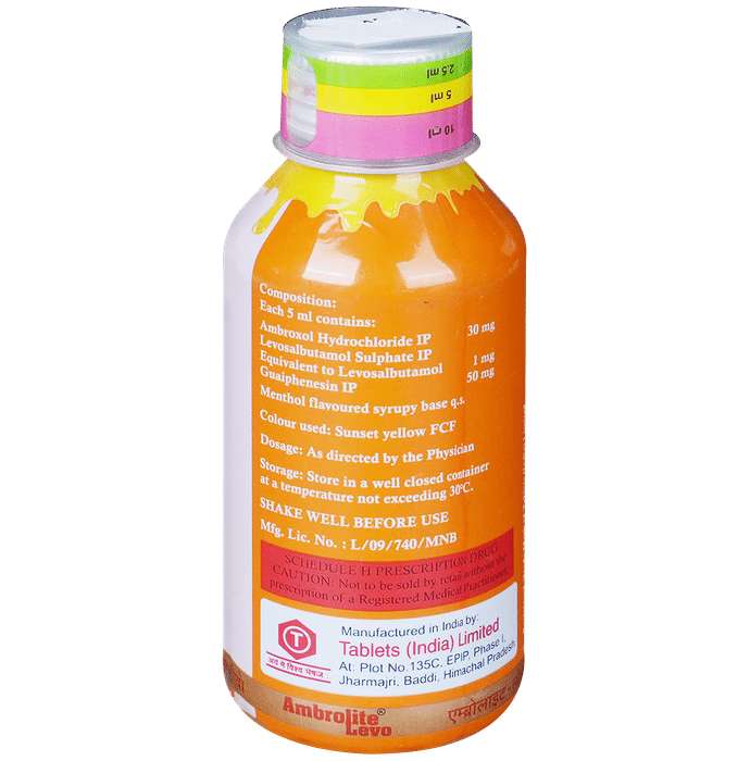 Take this medicine in the dose and duration as advised by your doctor. Check the label for directions before use. Measure it with a measuring cup and take it by mouth. Shake well before use. Ambrolite Levo Syrup may be taken with or without food, but it is better to take it at a fixed time.: