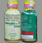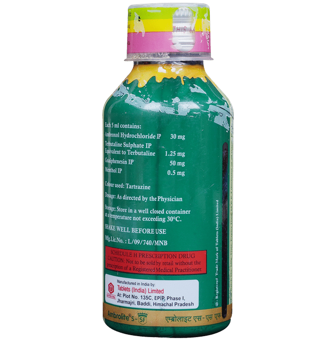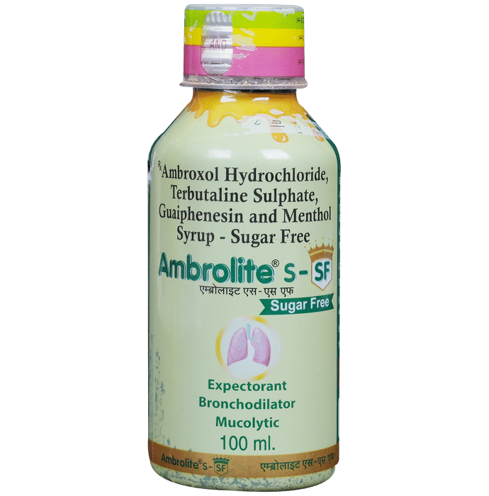 Ambrolite S-SF Syrup Sugar Free is a combination medicine used to treat cough. It thins the mucus in the nose and windpipe, making it easier to cough out. This medicine also relieves throat irritation and provides cooling sensation. Ambrolite S-SF Syrup Sugar Free is taken with or without food in a dose and duration as advised by the doctor. The dose you are given will depend on your condition and how you respond to the medicine. You should keep taking this medicine for as long as your doctor recommends. If you stop treatment too early your symptoms may come back and your condition may worsen. Let your doctor know about all other medications you are taking as some may affect, or be affected by this medicine.The most common side effects are nausea, diarrhea, vomiting, stomach discomfort, headache, rash, tremor, and increased heart rate. Most of these are temporary and usually resolve with time. Contact your doctor straight away if you are at all concerned about any of these side effects. This medicine can also cause sleepiness, so do not drive or do anything that requires mental focus until you know how this medicine affects you. Avoid drinking alcohol while taking this medicine as it can make sleepiness worse.Never support self-medication or recommend your medicine to another person. It is beneficial to have plenty of fluids while taking this medication. Before taking this medicine, you should tell your doctor if you are pregnant, planning pregnancy or breastfeeding.: