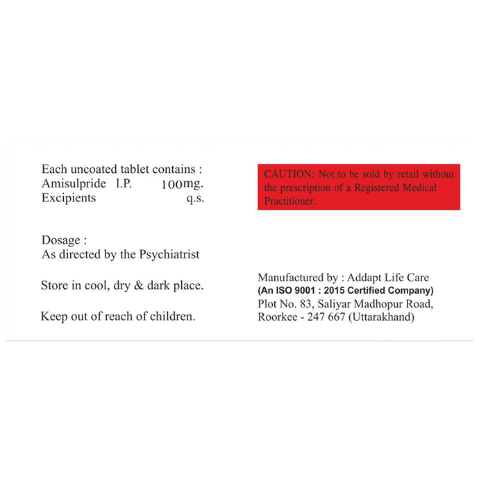 Does Amiliv 100 Tablet make you sleepy?::: Yes, Amiliv 100 Tablet may make you sleepy, drowsy, less alert, and may even blur your vision. If you experience these symptoms you should not drive or operate heavy machinery.| When should I take Amiliv 100 Tablet?::: The time of taking the medicine will be suggested by your doctor depending upon your dose. Doses up to 300 mg can be taken anytime of the day but preferably at the same time each day. Doses more than 300 mg can be taken half in the morning and half in the evening. You can take the medicine during or between meals.| What does Amiliv 100 Tablet do to the brain?::: Amiliv 100 Tablet belongs to antipsychotic class of medicines. It acts against dopamine receptors in the brain. Dopamine is a neurotransmitter which helps in regulating mood and behavior. Schizophrenia is associated with an overactivity of dopamine in the brain, and this overactivity may cause delusions and hallucinations. Amiliv 100 Tablet prevents this excessive activity of dopamine in the brain which helps in treating symptoms of schizophrenia.| Does Amiliv 100 Tablet help with anxiety?::: No, there is no data to support the use of Amiliv 100 Tablet in the treatment of anxiety. On the contrary, anxiety is a common side effect of Amiliv 100 Tablet.| Can I stop taking Amiliv 100 Tablet after some time?::: No, you should keep taking Amiliv 100 Tablet as long as your doctor has advised. Do not stop the medication even if you feel better. Stopping it suddenly may worsen your condition or symptoms may come back. Talk to your doctor who will gradually reduce your dose.| Who should not take Amiliv 100 Tablet?::: You should not take Amiliv 100 Tablet if you are under 15 years of age, allergic to it, have breast cancer or a tumor known as prolactinoma. Avoid taking Amiliv 100 Tablet if you are breastfeeding, have tumor of adrenal glands (pheochromocytoma), or if you are taking certain medicines like levodopa, medicines to treat heart rhythm disorders, etc.| Is Amiliv 100 Tablet addictive?::: No, there is no evidence to say that Amiliv 100 Tablet causes addiction. Also, its use is not known to have any tendency for abuse.| What are the withdrawal symptoms of Amiliv 100 Tablet?::: Suddenly stopping Amiliv 100 Tablet may cause withdrawal symptoms which include nausea, vomiting, sweating, difficulty sleeping, extreme restlessness, muscle stiffness or abnormal movements, or your original condition may come back. Therefore, it is advised to gradually reduce the dose of Amiliv 100 Tablet.: