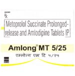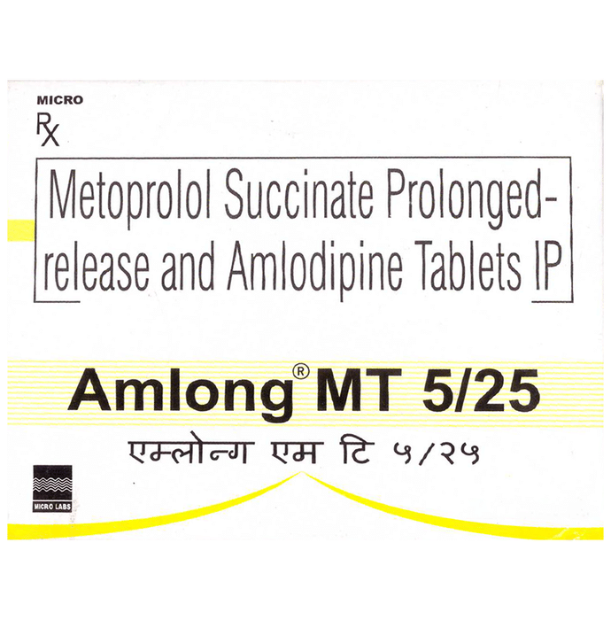 Amlong MT 5/25 Tablet PR contains two medicines, both of which help to control high blood pressure and heart rate. It is also used for heart-related chest pain (angina), abnormal heart rhythms and chronic (long-term) heart failure. You can take Amlong MT 5/25 Tablet PR at any time of day, with or without food, but it is best to take it at the same time each day. Keep taking it for as long as advised by your doctor. Even if you feel well, do not stop this medicine on your own because high blood pressure often has no symptoms. If you stop taking it, your condition may get worse. Keeping active with regular exercise, reducing your weight and eating a healthy diet will also help control your blood pressure. Follow your doctor’s advice while taking this medicine.It may cause side effects like headache, ankle swelling, skin rash, slow heart rate, nausea,a nd depression. It may also cause dizziness, so do not drive or do anything that requires mental focus until you know how this medicine affects you. This might raise the level of potassium in the blood, hence avoid potassium rich food or supplements. You may be asked for regular monitoring of blood pressure, kidney function, and electrolytes level while on the treatment.Before taking it, let your doctor know if you have any liver or kidney problems. Pregnant or breastfeeding women should also consult their doctor for advice before taking this medicine. You also need to tell your doctor what other medicines you are taking especially those used to treat high blood pressure or heart conditions.: