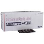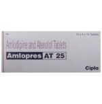 Amlopres AT 25 Tablet is used to treat hypertension (high blood pressure) and angina. This is a combination of two medicines that controls blood pressure when a single medication is not effective. It helps to lower high blood pressure and thus reduces the chances of future heart attack and stroke. Amlopres AT 25 Tablet may be taken with or without food. Take it at the same time each day. Keep taking it for as long as advised by your doctor. Even if you feel well, do not stop this medicine on your own because high blood pressure often has no symptoms. If you stop taking it, your condition may get worse. Keeping active with regular exercise, reducing your weight and eating a healthy diet will also help control your blood pressure. Follow your doctor’s advice while taking this medicine.It may cause side effects like headache, slow heart rate, and nausea. It may also cause dizziness, so do not drive or do anything that requires mental focus until you know how this medicine affects you. This might raise the level of potassium in the blood, hence avoid potassium rich food or supplements. You may be asked for regular monitoring of blood pressure, kidney function, and electrolytes level while on the treatment.Before taking it, let your doctor know if you have any liver or kidney problems. Pregnant or breastfeeding women should also consult their doctor for advice before taking this medicine. You also need to tell your doctor what other medicines you are taking especially those used to treat high blood pressure or heart conditions.: