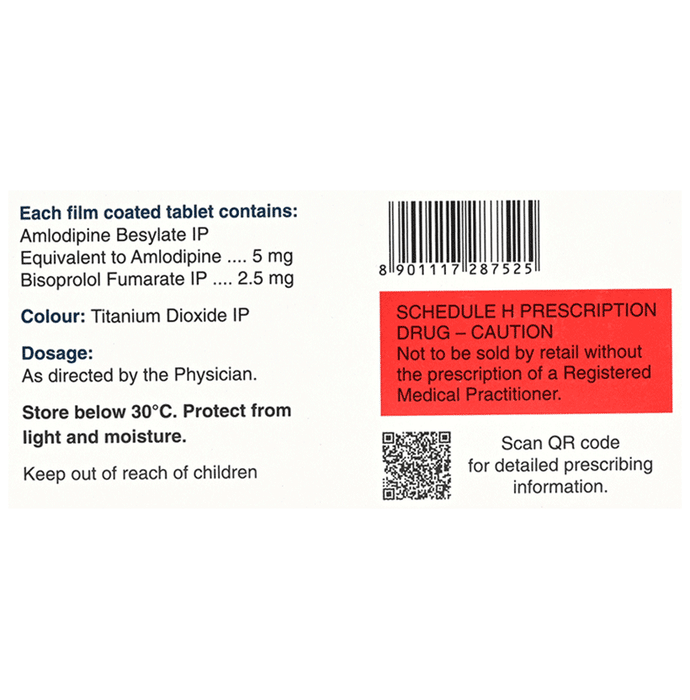 Amlopres B 2.5 Tablet is a combination of two medicines: Amlodipine and Bisoprolol, which lowers blood pressure effectively. Amlodipine is a calcium channel blocker which works by relaxing blood vessels while bisoprolol is a beta blocker that works specifically on the heart to slow down the heart rate.: