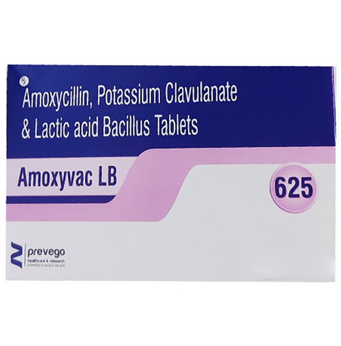 Amoxyvac LB Tablet is a combination medicine that is used to treat various types of bacterial infections. It fights against the microorganisms to prevent their growth and further spread of the infection. It also prevents diarrhea which may occur as side effect of this medicine. Amoxyvac LB Tablet is a prescription medicine. It is advised to take it as per the prescription. It can be taken with or without food, but it must be taken at a fixed time to ensure better efficacy. Do not consume more than the recommended dose, as this may have harmful effects on your body. If you miss a dose, take it as soon as you remember. The course of the treatment must be completed even if you feel better. Sudden discontinuation of the treatment may affect the potency of the medicine.Some common side effects of this medicine are nausea, vomiting, diarrhea, indigestion, etc. If any of the side effects get aggravated, you must consult your doctor immediately. If you experience any allergic reaction (rashes, itching, swelling, shortness of breath, etc.), you must seek immediate medical help.Before taking this medicine, you should tell your doctor if you are taking any medicines for any health condition. Pregnant or breastfeeding women should also consult with their doctor before taking it. Avoid drinking alcohol as it can cause excessive drowsiness with this medicine. It usually does not impair your ability to drive, but you should not drive if it makes you feel sleepy or dizzy. You must take adequate rest for a faster recovery, also take a healthy diet and drink plenty of water. Your doctor may ask for a few laboratory and diagnostic tests to know the effects of the medicine on your body.: