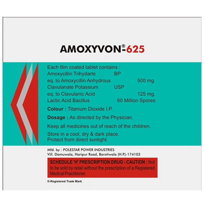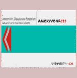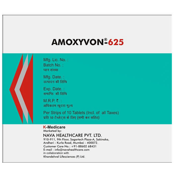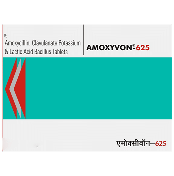 Amoxyvon 625 Tablet is a combination medicine that is used to treat various types of bacterial infections. It fights against the microorganisms to prevent their growth and further spread of the infection. It also prevents diarrhea which may occur as side effect of this medicine. Amoxyvon 625 Tablet is a prescription medicine. It is advised to take it as per the prescription. It can be taken with or without food, but it must be taken at a fixed time to ensure better efficacy. Do not consume more than the recommended dose, as this may have harmful effects on your body. If you miss a dose, take it as soon as you remember. The course of the treatment must be completed even if you feel better. Sudden discontinuation of the treatment may affect the potency of the medicine.Some common side effects of this medicine are nausea, vomiting, diarrhea, indigestion, etc. If any of the side effects get aggravated, you must consult your doctor immediately. If you experience any allergic reaction (rashes, itching, swelling, shortness of breath, etc.), you must seek immediate medical help.Before taking this medicine, you should tell your doctor if you are taking any medicines for any health condition. Pregnant or breastfeeding women should also consult with their doctor before taking it. Avoid drinking alcohol as it can cause excessive drowsiness with this medicine. It usually does not impair your ability to drive, but you should not drive if it makes you feel sleepy or dizzy. You must take adequate rest for a faster recovery, also take a healthy diet and drink plenty of water. Your doctor may ask for a few laboratory and diagnostic tests to know the effects of the medicine on your body.: