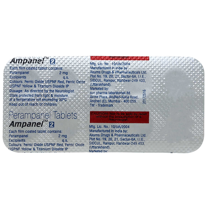 Ampanel 2 Tablet belongs to a class of medicines known as antiepileptics. It is used to treat epilepsy (seizures) in people who have repeated seizures (fits). It helps reduce the frequency of seizures that affect a part or whole of the brain. Ampanel 2 Tablet is taken by mouth with or without food. However, it is advised to take it at the same time each day, preferably before going to bed. Take this medicine in the dose and duration as advised by your doctor as it has a high potential of habit-forming. If you have missed a dose, take it as soon as you remember it. Do not skip any doses and finish the full course of treatment even if you feel better. Do not stop taking it suddenly without talking to your doctor as it may increase seizure frequency.Some common side effects of this medicine include fatigue, anger, nausea, and balance disorder (loss of balance). It may also cause dizziness and sleepiness, so do not drive or do anything that requires mental focus until you know how this medicine affects you. This medicine may cause weight gain and to control it, you should have a balanced diet and exercise regularly. It is important to inform your doctor if you develop any unusual changes in mood or depression as it may lead to suicidal thoughts.Before taking it, you should tell your doctor if you have kidney problems, depression, or suicidal thoughts and if you are pregnant or planning to become pregnant. You should not breastfeed while taking this medicine. Alcohol may increase the risk of seizures and worsen the side effects such as drowsiness and dizziness. Avoid alcohol while taking this medicine. Your kidney function may need to be tested often while taking this medicine.: