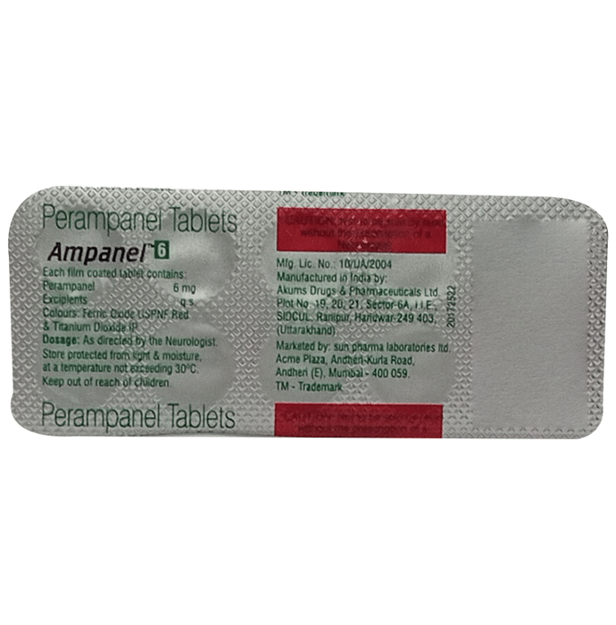 Ampanel 6 Tablet belongs to a class of medicines known as antiepileptics. It is used to treat epilepsy (seizures) in people who have repeated seizures (fits). It helps reduce the frequency of seizures that affect a part or whole of the brain. Ampanel 6 Tablet is taken by mouth with or without food. However, it is advised to take it at the same time each day, preferably before going to bed. Take this medicine in the dose and duration as advised by your doctor as it has a high potential of habit-forming. If you have missed a dose, take it as soon as you remember it. Do not skip any doses and finish the full course of treatment even if you feel better. Do not stop taking it suddenly without talking to your doctor as it may increase seizure frequency.Some common side effects of this medicine include fatigue, anger, nausea, and balance disorder (loss of balance). It may also cause dizziness and sleepiness, so do not drive or do anything that requires mental focus until you know how this medicine affects you. This medicine may cause weight gain and to control it, you should have a balanced diet and exercise regularly. It is important to inform your doctor if you develop any unusual changes in mood or depression as it may lead to suicidal thoughts.Before taking it, you should tell your doctor if you have kidney problems, depression, or suicidal thoughts and if you are pregnant or planning to become pregnant. You should not breastfeed while taking this medicine. Alcohol may increase the risk of seizures and worsen the side effects such as drowsiness and dizziness. Avoid alcohol while taking this medicine. Your kidney function may need to be tested often while taking this medicine.: