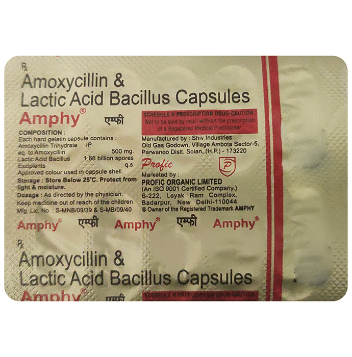 Amphy Capsule is a combination of two medicines: Amoxycillin and Lactobacillus. Amoxycillin is an antibiotic which works by preventing the formation of the bacterial protective covering that is essential for the survival of bacteria in the human body. Lactobacillus is a live microorganism which restores the balance of good bacteria in the intestine that may get upset with antibiotic use or due to intestinal infections.: