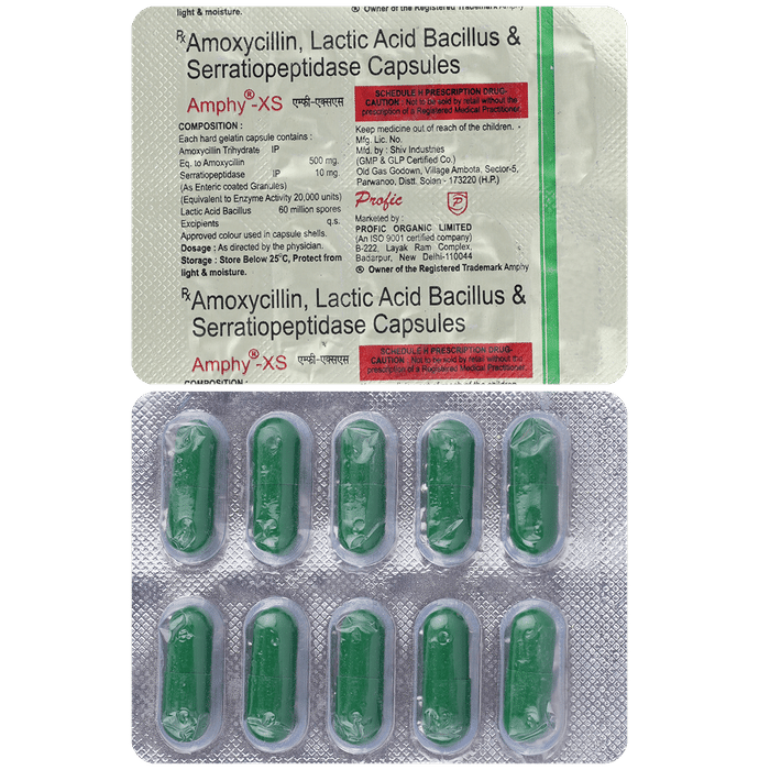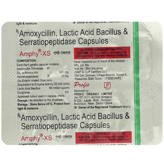 Amphy XS Capsule is a combination medicine that is used to treat various types of bacterial infections. It fights against the microorganisms to prevent their growth and further spread of the infection. Amphy XS Capsule is a prescription medicine. It is advised to take it as per the prescription. It can be taken with or without food, but it must be taken at a fixed time to ensure better efficacy. Do not consume more than the recommended dose, as this may have harmful effects on your body. If you miss a dose, take it as soon as you remember. The course of the treatment must be completed even if you feel better. Sudden discontinuation of the treatment may affect the potency of the medicine.Some common side effects of this medicine are nausea, vomiting, diarrhea, indigestion, etc. If any of the side effects get aggravated, you must consult your doctor immediately. If you experience any allergic reaction (rashes, itching, swelling, shortness of breath, etc.), you must seek immediate medical help.Before taking this medicine, you should tell your doctor if you are taking any medicines for any health condition. Pregnant or breastfeeding women should also consult with their doctor before taking it. Avoid drinking alcohol as it can cause excessive drowsiness with this medicine. It usually does not impair your ability to drive, but you should not drive if it makes you feel sleepy or dizzy. You must take adequate rest for a faster recovery, also take a healthy diet and drink plenty of water. Your doctor may ask for a few laboratory and diagnostic tests to know the effects of the medicine on your body.:
