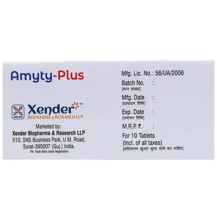 Amyty-Plus Tablet is a combination of two medicines. It is used in the treatment of depression associated with anxiety. It helps in regulating mood and to reduce anxiety. Amyty-Plus Tablet is taken with or without food. However, it is advised to take it at a fixed time each day to maintain a consistent level of medicine in the blood. In case you miss a dose of this medicine, take it as soon as you remember. Never skip any dose and finish the full course of treatment even if you feel better. It is important that this medication is not stopped suddenly without talking to the doctor as it may worsen your symptoms. Taking this medicine for a long time may require regular monitoring of blood and liver functions.Some common side effects of this medicine include constipation, difficulty in urination, weight gain, confusion, orthostatic hypotension (sudden lowering of blood pressure on standing). This medicine may cause weight loss. In case of losing weight, consult a dietitian for dietary supplements or try to increase your food portion. Most of the common side effects tend to be mild. Your doctor may be able to suggest ways of preventing or reducing side effects if they bother you or do not go away. Serious side effects are rare. Remember to inform your doctor if you develop any unusual changes in mood as it may lead to suicidal thoughts.Take caution while taking medicine if you are suffering from liver disease. Your doctor should also know about all other medicines you are taking as many of these may make this medicine less effective or change the way it works. Inform your doctor if you are pregnant, planning pregnancy or breastfeeding.