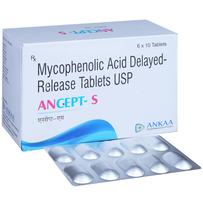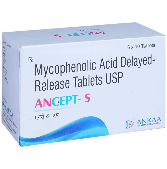 Manufacturer details: Marketer details:Ankaa Pharmaceutical | 6/16 a, d/s jangpura extension, bhogal, delhi-110014, india, Description:Ancept-S Tablet DR belongs to a group of medicines called immunosuppressants. It is used with other medicines to prevent your body from rejecting an organ (such as a kidney, heart, or liver) after a transplant. It works by weakening your body’s immune system, so it does not attack the transplanted organ. The amount of Ancept-S Tablet DR you take depends on the type of transplant you have. Follow your doctor’s instructions on this. This medicine may be taken with our without food. Swallow it as a whole, do not crush, chew, break, or open them. Take the medicine regularly to get the most benefit and keep taking it even if you feel well. If you stop taking it, you may increase the chances of rejecting your transplanted organ. The treatment will continue for as long as you need it to prevent rejection.The most common side effects of Ancept-S Tablet DR are nausea, vomiting, diarrhea, stomach pain, headache, high blood pressure, and changes in the number of white blood cells. Because it suppresses your immune system, you may catch more infections than usual. There is also an increased risk of developing some cancers for this reason. There is a long list of potential side effects. You should ask your doctor about them and what signs to look out for because some can be serious and need urgent medical attention.This medicine can cause birth defects and miscarriages so do not take it if you are pregnant, planning to become pregnant, or breastfeeding. You should talk to your doctor before taking this medicine if you have any signs of infection, if you have any unexpected bruising or bleeding and if you have ever had a problem with your digestive system. Your doctor also needs to know what other medicines you are taking as there are many which interact with this medicine and affect the way it works. You will have regular tests to check for any changes in the number of your blood cells, inform your doctor if you notice unexplained bruising or bleeding, sore throat, mouth ulcers, or fever.