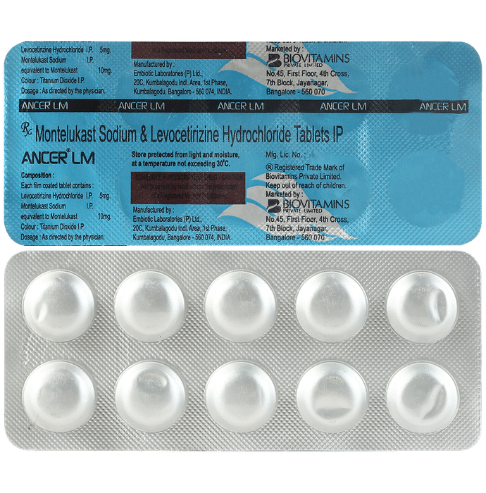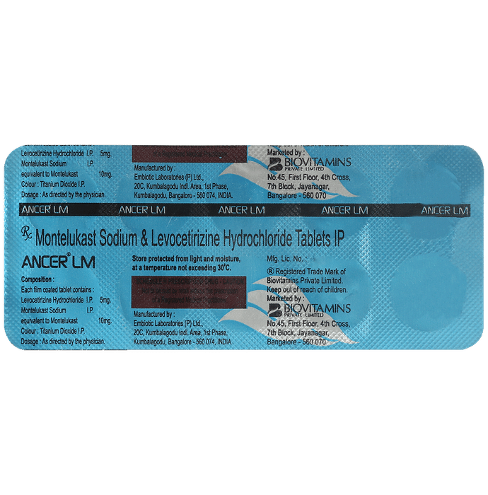 Manufacturer details: Marketer details:Bio Vitamins | Biovitamins Private Limited, No.45, 1st Floor, 4th Cross, 7th Block, Jayanagar, Bangalore – 560070, Description:Ancer LM Tablet is a combination medicine used in the treatment of allergic symptoms such as runny nose, stuffy nose, sneezing, itching, swelling, watery eyes and congestion or stuffiness. It also reduces inflammation in the airways and make breathing easier. Ancer LM Tablet is taken with or without food in a dose and duration as advised by the doctor. The dose you are given will depend on your condition and how you respond to the medicine. You should keep taking this medicine for as long as your doctor recommends. If you stop treatment too early your symptoms may come back and your condition may worsen. Let your healthcare team know about all other medications you are taking as some may affect, or be affected by this medicine.The most common side effects are nausea, diarrhea, vomiting, dryness in the mouth, headache, skin rash, flu-like symptoms, and fatigue. Most of these are temporary and usually resolve with time. Contact your doctor straight away if you are at all concerned about any of these side effects. This medicine may cause dizziness and sleepiness, so do not drive or do anything that requires mental focus until you know how this medicine affects you. Avoid drinking alcohol while taking this medicine as it can worsen your sleepiness.Never support self-medication or recommend your medicine to another person. It is beneficial to have plenty of fluids while taking this medication. Before you start taking this medicine it is important to inform your doctor if you are suffering from kidney disease.