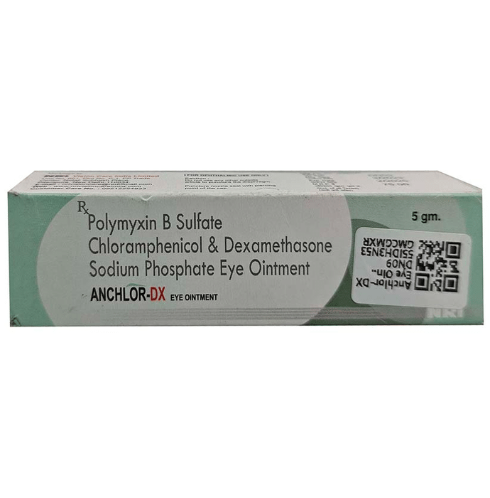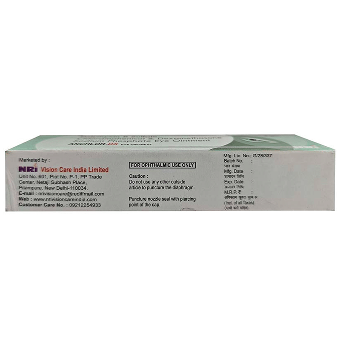 Manufacturer details:                                        Marketer details:Nri Vision Care India Limited | Rajapur, Sector 9, Rohini, Delhi, 110085,                                                Description:Anchlor-DX Eye Ointment is a combination of three medicines. It is used in treating bacterial infections of the eyes. It kills the bacteria that cause infection. It also relieves pain, itching, discomfort, and irritation. Anchlor-DX Eye Ointment is strictly advised to be used only in the eyes. Use it in the prescribed dose and duration. Apply it only to the affected eyes. You must wash your hand before administering the medicine. Do not use it more than the recommended dose. The medicine should not be stopped suddenly without a doctor’s consultation.It is generally safe, but it may sometimes cause discomfort, irritation, and burning sensation in the eyes. These effects are mild and go away in some time. However, if these effects persist, you should consult the doctor immediately.