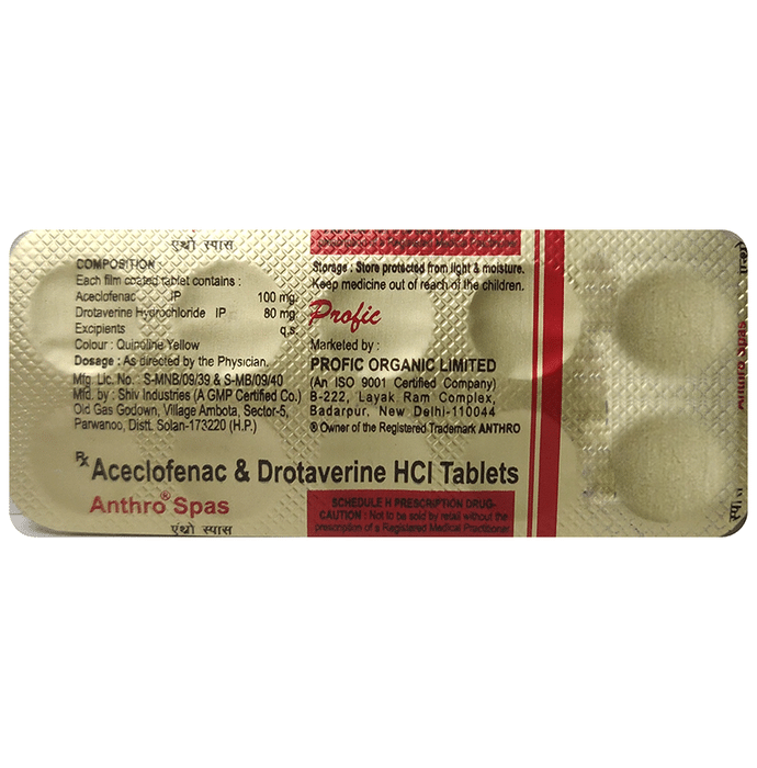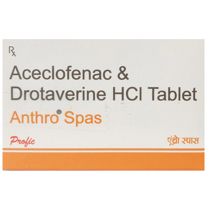 Manufacturer details:                                                                                Marketer details:Profic Organic Ltd | B-222, Layak Ram Complex, Badarpur, New Delhi- 110044,                                                                                                Description:Anthro Spas Tablet is a combination medicine used in the treatment of abdominal pain. It works effectively to reduce abdominal pain, bloating, discomfort and cramps by relaxing the muscles of the stomach and gut. It also blocks certain chemical messengers that cause pain and discomfort. Anthro Spas Tablet is taken with food in a dose and duration as advised by the doctor. The dose you are given will depend on your condition and how you respond to the medicine. You should keep taking this medicine for as long as your doctor recommends. If you stop treatment too early your symptoms may come back and your condition may worsen. Let your healthcare team know about all other medications you are taking as some may affect, or be affected by this medicine.The most common side effects are diarrhea, nausea, vomiting, stomach pain, loss of appetite, dryness in the mouth, feeling thirsty, and heartburn. Most of these are temporary and usually resolve with time. Contact your doctor straight away if you are at all concerned about any of these side effects. It may also cause dizziness, so do not drive or do anything that requires mental focus until you know how this medicine affects you. Avoid drinking alcohol while taking this medicine as it can worsen your dizziness.Before taking this medicine, you should tell your doctor if you are pregnant, planning pregnancy or breastfeeding. You should also tell your doctor if you have any kidney or liver diseases so that your doctor can prescribe a suitable dose for you.