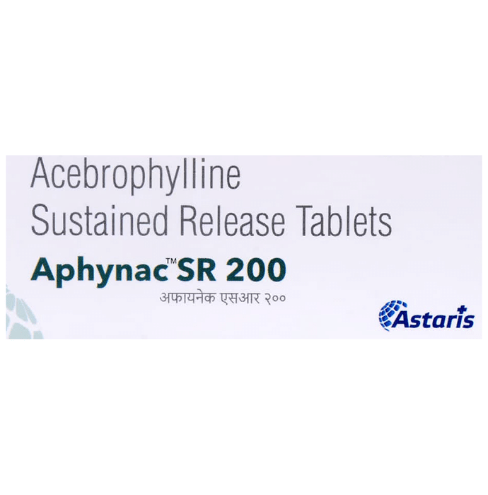 Aphynac SR 200 Tablet is used to treat and prevent symptoms of asthma, bronchitis, and chronic obstructive pulmonary disorder (a lung disorder in which flow of air to the lung is blocked). It helps in relaxing the muscles of the air passages, thus widening it and making it easier to breathe. Aphynac SR 200 Tablet can be taken with the food in evening. Take it at the same time every day to get the most benefit. The dose and how often you take it depends on what you are taking it for. Your doctor will decide how much you need to improve your symptoms. Take this medicine for as long as it is prescribed for you. Do not miss even a single dose, if in any case, you missed a dose, take it as soon as you remember or better to skip the missed dose and continue with regular dosing. It does not work immediately or prevent the already started breathing trouble, hence always carry your medical inhaler with you for an emergency.The most common side effects of this medicine include abdominal discomfort, abdominal distension, vomiting, abdominal pain, diarrhea, constipation, and heart burn. If these bother you or appear serious, let your doctor know. There may be ways of reducing or preventing them. Generally, it is advised not to consume alcohol or do not smoke while on treatment.Before taking this medicine, let your doctor if you have kidney or liver disease or if you have heart-related problems. Your doctor should also know about all other medicines you are taking as many of these may make this medicine less effective or change the way it works. Inform your doctor if you are pregnant or breastfeeding before starting the treatment.