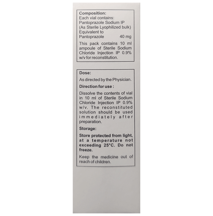 Manufacturer details:                                        Marketer details:Ajanta Pharma Ltd | Ajanta House, Charkop, Kandivli West, Mumbai 400 067, India,                                                Description:Apnicid 40 Injection is a medicine that reduces the amount of acid produced in your stomach. It is used for treating acid-related diseases of the stomach and intestine such as acid reflux, peptic ulcer disease, Zollinger-Ellison syndrome. It provides relief from symptoms and promotes healing. Apnicid 40 Injection is also used to prevent stress ulcers in seriously ill patients and is administered before anesthetic medication to help prevent aspiration-related complications. It belongs to a class of medicines known as proton pump inhibitors (PPIs). This medicine is administered into a vein by a healthcare professional and will only be given to you if your doctor thinks that an injection is more suitable for you at the moment than a tablet. The dose will depend on your underlying condition and how you respond to the medicine. Your doctor will decide the duration of treatment but you should keep on taking it as prescribed, even if your symptoms disappear quickly. You can increase the efficiency of the treatment by eating smaller meals more often and avoiding caffeinated drinks (like tea and coffee), and spicy or fatty foods.The most common side effects observed with this medicine include nausea, vomiting, headache, dizziness, flatulence, diarrhea, stomach pain, and thrombophlebitis (pain, redness, and swelling of the vein). These symptoms are generally mild but if they bother you or do not go away, consult your doctor. Long-term use of this medicine may lead to an increased risk of side effects. For instance, using this medicine for more than 1 year may increase your risk for bone fractures, especially with higher doses. Talk to your doctor about ways to prevent bone loss (osteoporosis), like taking calcium and vitamin D supplements.Apnicid 40 Injection is not suitable for some people. Before taking this medicine, you need to tell your doctor if you have severe liver problems, are taking medicines for HIV, have ever had an allergic reaction to similar medicines in the past, or suffer from bone loss (osteoporosis). Pregnant or breastfeeding women should also consult their doctor before taking it. Avoid drinking alcohol as it makes your stomach produce excessive acid and can worsen your symptoms. Do not drive or use machinery or tools, if this medicine makes you feel dizzy or sleepy.