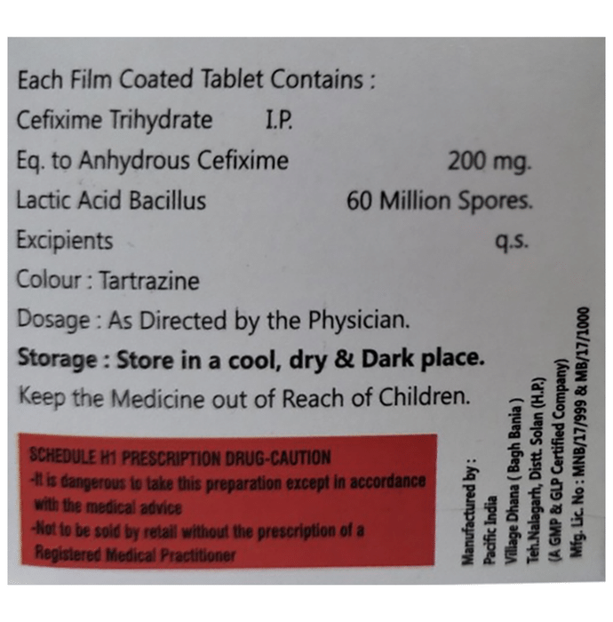 Marketer:Apotek Pharma Private Limited,Composition:Cefixime (200mg) + Lactobacillus (60Million spores),medicine_type:,