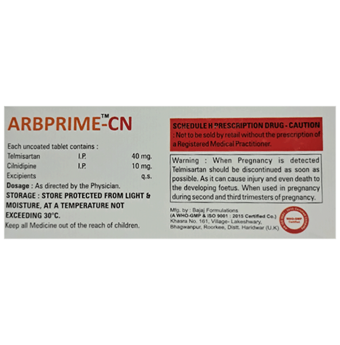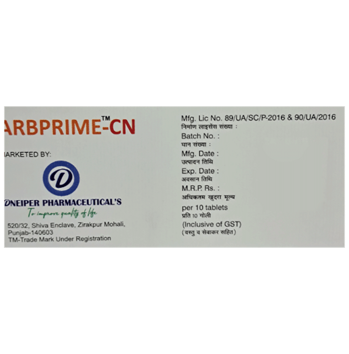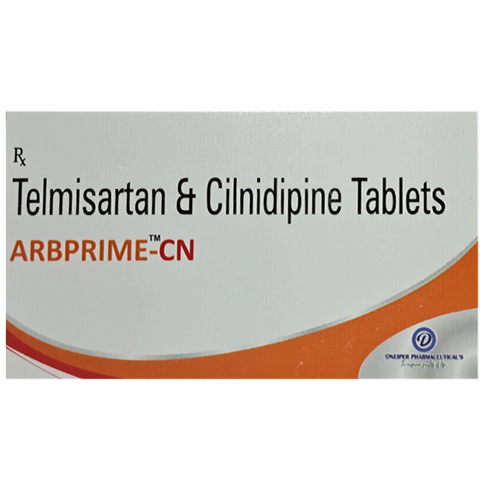 Manufacturer details: Marketer details:Dneiper Pharmaceuticals | 520/32, Shiva Enclave,Zirakpur Mohali Punjab-140603, Description:Arbprime-CN Tablet contains two medicines, both of which help to control high blood pressure. It lowers the blood pressure by relaxing the blood vessels and making it easier for your heart to pump blood around your body. This will reduce your risk of having a heart attack or a stroke. Arbprime-CN Tablet may be taken on an empty stomach or along with food. However, it is better to take it regularly at a fixed time each day, as prescribed by your doctor. The dose will depend on your condition and how you respond to the medicine. It’s important to keep taking this medicine even if you feel well. By lowering your blood pressure, it is reducing your risk of heart attack or stroke so do not stop taking it unless your doctor tells you to. You can help this medication work better by making a few changes to your lifestyle such as keeping active, stopping smoking, and eating a low salt and low-fat diet. The most common side effects of this medicine include swelling in your ankles or feet (edema), headache, sleepiness, dizziness, tiredness, taste change, and upset stomach. Since it may cause dizziness, do not drive or do anything requiring concentration until you know how it affects you. Talk to your doctor if any of the side effects bother you or will not go away.Before taking this medicine, let your doctor know if you have any kidney or liver problems or severe dehydration. Pregnant or breastfeeding women should also consult their doctor before taking it. While using this medicine, your blood pressure will need to be checked often and your kidney function may also need to be tested.