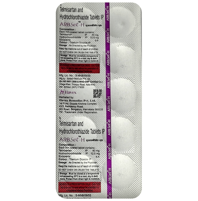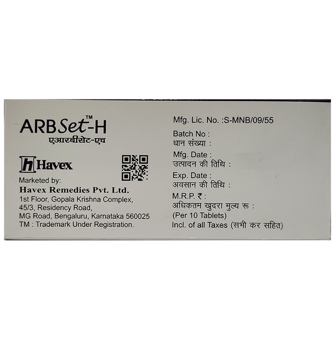 Manufacturer details:                                        Marketer details:Havex Remedies Pvt. Ltd. | 1st Floor, Gopala Krishna Complex. 45/3, Residency Road, MG Road, Bengaluru, Karnataka, 560025, India,,                                                Description:Arbset-H Tablet contains two medicines, both of which help to control high blood pressure. It is generally used when one medicine alone is not controlling the blood pressure effectively. Lowering blood pressure helps to reduce your risk of having a heart attack or a stroke in the future. You can take Arbset-H Tablet with or without food. The dose will depend on your condition and how you respond to the medicine. Try to take it at the same time each day. It’s important to keep taking this medicine until your doctor tells you not to. It contains a diuretic (water pill) and will make you urinate more, so it is best to avoid taking this medicine within four hours of going to bed. Use this medicine regularly even if you feel better to get the most from it. High blood pressure does not usually have symptoms and if you stop taking it your risk of heart attack or stroke may increase.The most common side effect is dizziness. Other side effects include feeling tired, nausea, shortness of breath, and changes to your heartbeat. Frequent urination is not a side effect of this medicine. It is the purpose of this medicine as frequent urination helps control your blood pressure. You may experience other possible side effects, but most are rare. Make sure you read the leaflet that comes with your medicines and tell your doctor if you are bothered by side effects or they do not go away. It may be possible to adjust your dose or try a different medicine.Do not use potassium supplements or salt substitutes unless your doctor has told you to. This medicine is not recommended during pregnancy or while breastfeeding. You should ask your doctor before taking it if you have kidney or liver disease, heart trouble or diabetes. Drinking alcohol can further lower your blood pressure and may cause side effects.