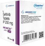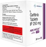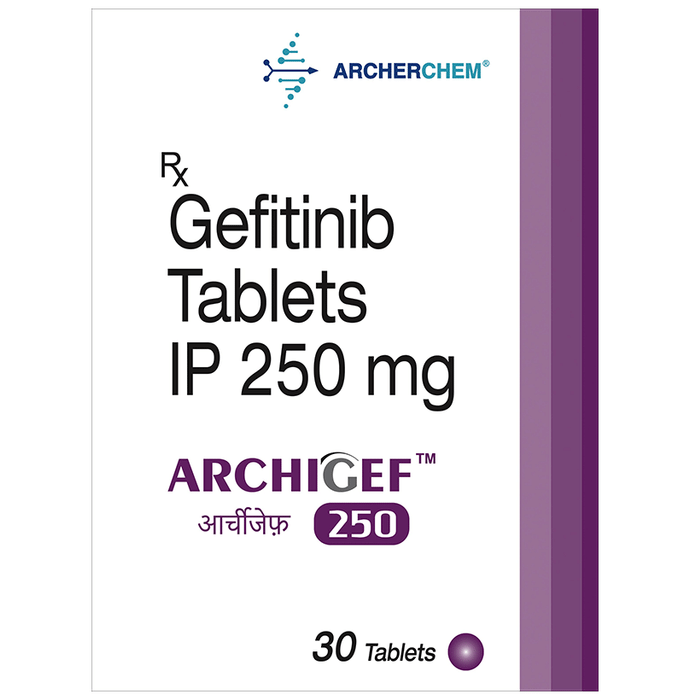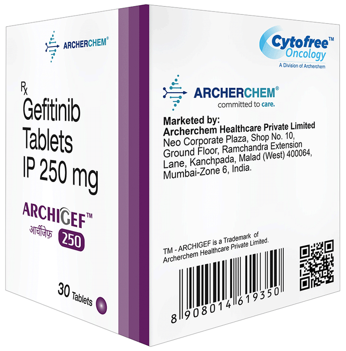 Manufacturer details:                                        Marketer details:Archerchem Healthcare Pvt Ltd | 802, Advent Atria, Chincholi Bunder Rd, above J Kumar International School, Malad West, Mumbai, Maharashtra 400064,                                                Description:Archigef 250 Tablet is used in the treatment of non-small cell lung cancer. It is used in patients in which it has spread to other parts of the body, who have abnormal epidermal growth factor receptor (EGFR) genes, and who have not had previous treatment for cancer. Archigef 250 Tablet should be taken in a dose as recommended by the doctor. You should continue to take it as long as your doctor advises for it. The duration of treatment varies according to your need and response to treatment. Your doctor may advice for regular monitoring of liver function while your taking this medicine.Common side effects include diarrhea, dry skin, loss of appetite, and nausea. Drink plenty of fluids to reduce the risk of side effects. Inform your doctor if any of the side effects bother you or get worse. In case you develop ulceration in mouth, changes in your vision, or breathing difficulties than it is better to inform the doctor.Women who are undergoing treatment should use effective contraception method. It is important to avoid pregnancy during the treatment and for a month after completing the course of medicine. Let your doctor also know about all the other medications you are taking.