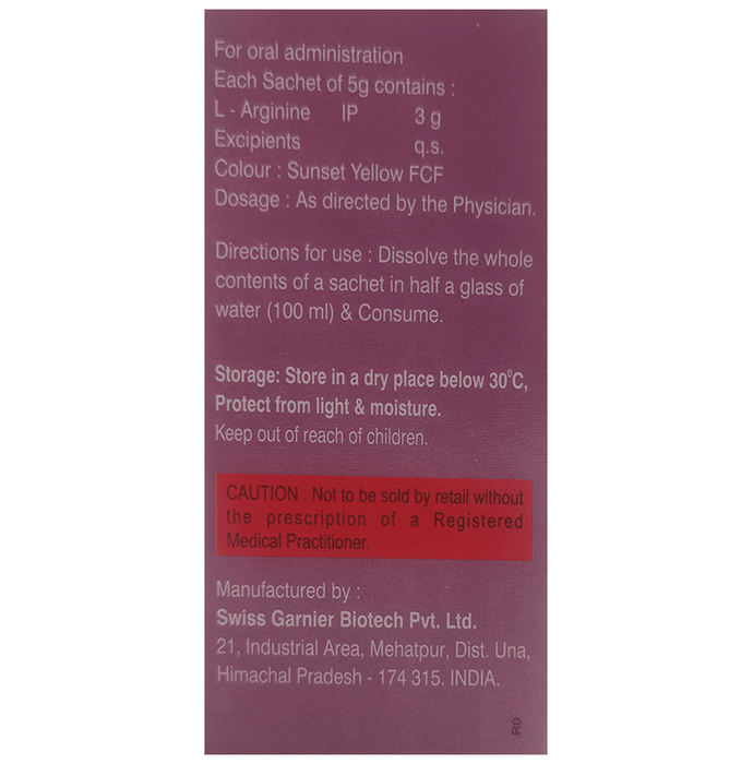 Package:Sachet,Qty:5 gm,Product Form:Granule ,prescription_required:,Fact_Box:Chemical Class :: Amino acids|Habit Forming :: No|Therapeutic Class :: VITAMINS MINERALS NUTRIENTS|Action Class :: Amino acids, primary_use:Treatment of Nutritional deficiencies,storage:Store below 30°C,                  common_side_effect:Bloating | Abdominal pain | Decreased blood pressure | Diarrhea | Gout | Airway inflammation | Aggravation of asthma | Nausea,      MANUFACTURER_ADDRESS:FF-13, SATYAM ARCADE OPP MORAIYA PATIYA AHMEDABAD,        country_of_origin:India,Q_A:</q_a>,                            How it works:,